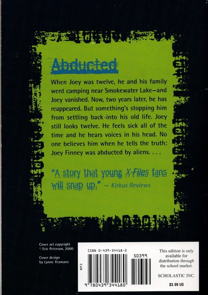 The last thing 12-year-old Joey remembers is that he got up in the middle of the night and headed to the restrooms just down the path from where his tent was pitched. The next thing he knows he's in the hospital after collapsing in a convenience store, being told by everyone how glad they are to have him back and that he's been gone for over two years. Joey can't tell them where he might have been or why he hasn't grown at all. Then the seizures start and Joey begins to remember what happened to him on that summer night. By chance, he gets an e-mail through one of the electronic bulletin boards for missing children that his mother has been on, and he tracks down a couple of college students who have a theory about what may have happened to him Alone that his returning memories support that he was abducted by aliens. The action and resolution of the story are fairly compressed and taut, and as for the believability who?s to say? We're talking alien abduction here, but the details are convincingly written. A few scenes with Joey's old best friend, who is now too cool to talk to him, and his now bigger, younger brother add the right pangs of adolescent angst. But one must question the author's wisdom in allowing her young character to pedal off on his bike to meet someone he's met on-line, purposefully concealing it from his parents. Although this book is a quick and exciting read, be aware that this one element can all too often lead to tragedy in the real world. Carrie Schadle, New York Public Library