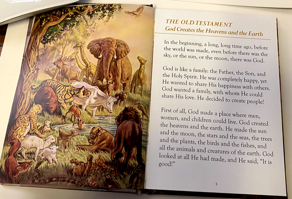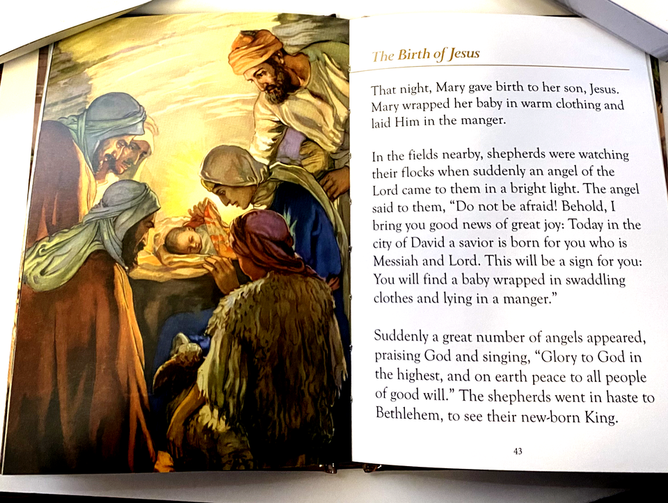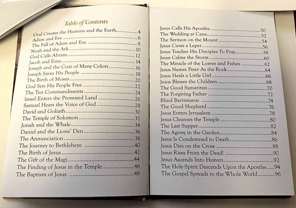 You are purchasing a very nice hardcover book "My First Bible" for children 5-9 years old. It contains 96 pages and comes from Aquinas Kids with the most beautiful illustrated pictures.It comes with 47 stories. It measures: 6.25" x 4.50".