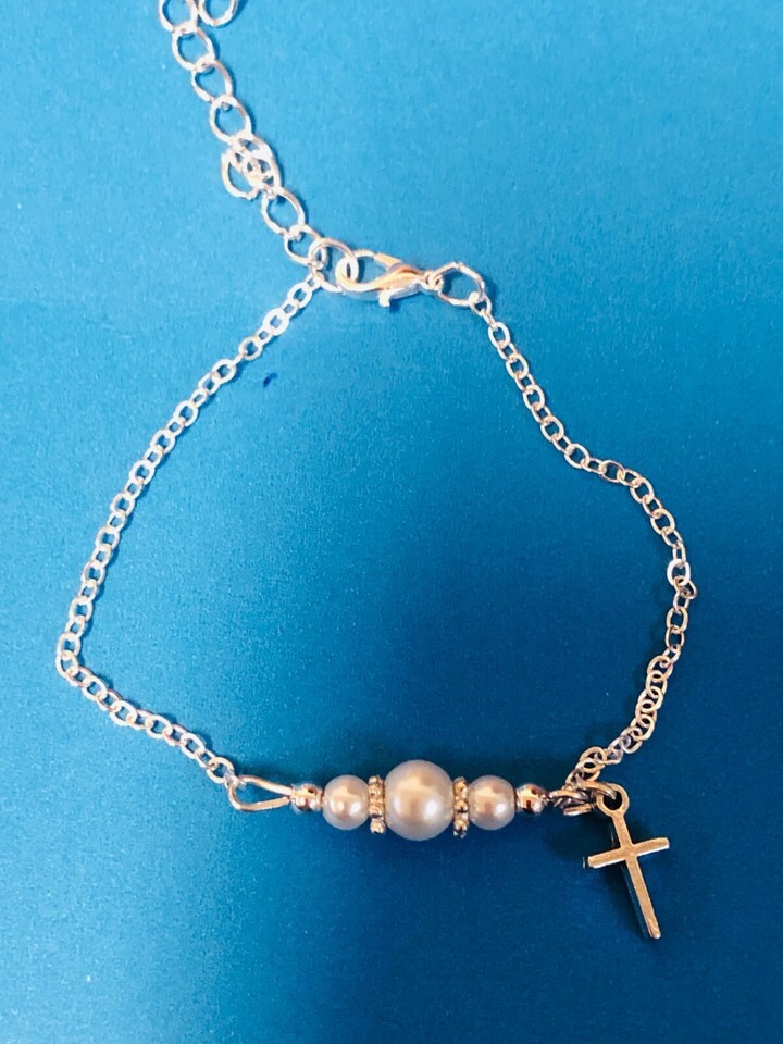 - Children's Glass Pearl Bracelet with Cross Charm 7" Adjustable, New #GFTSHP-034