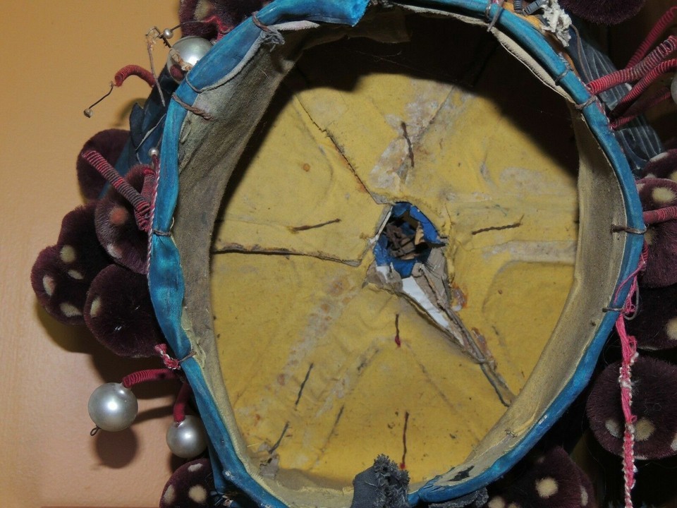 ONE HAT, SILK ON PAPER BOARD WITH ATTACHED HAND BLOWN GLASS BALLS AND FUZZY BALLS (POSSIBLY MOHAIR). PLEASE LOOK AT THE PICTURES CAREFULLY.