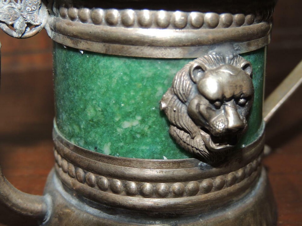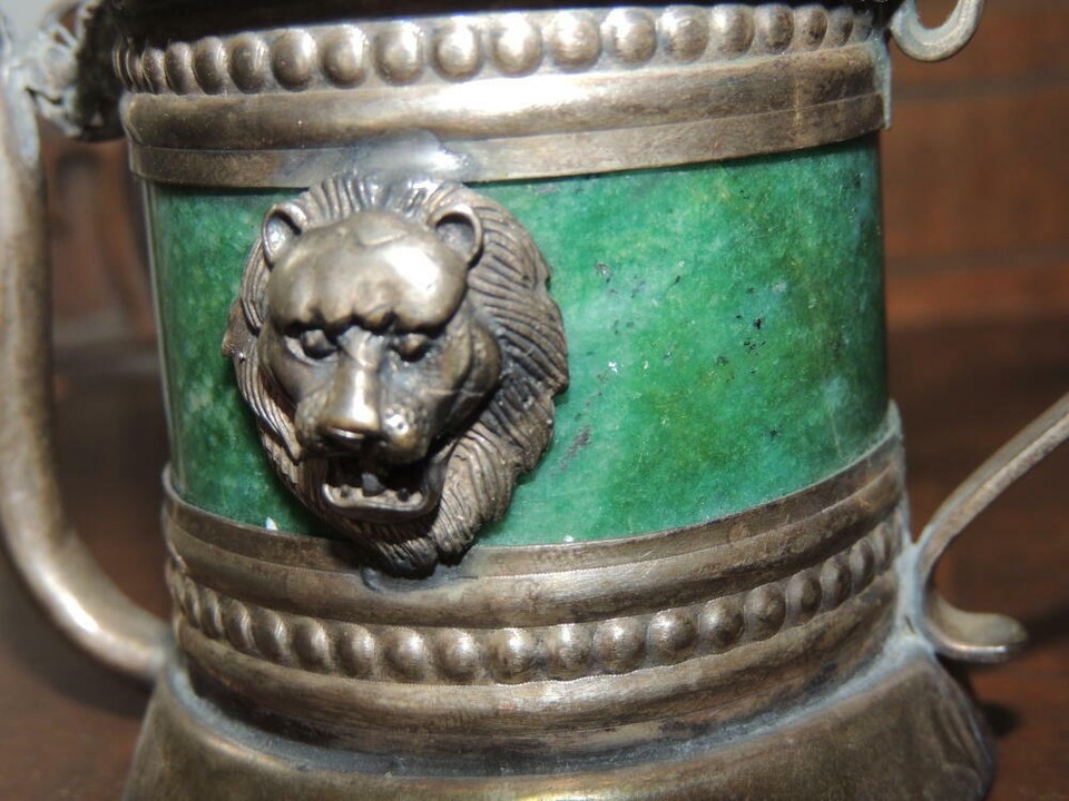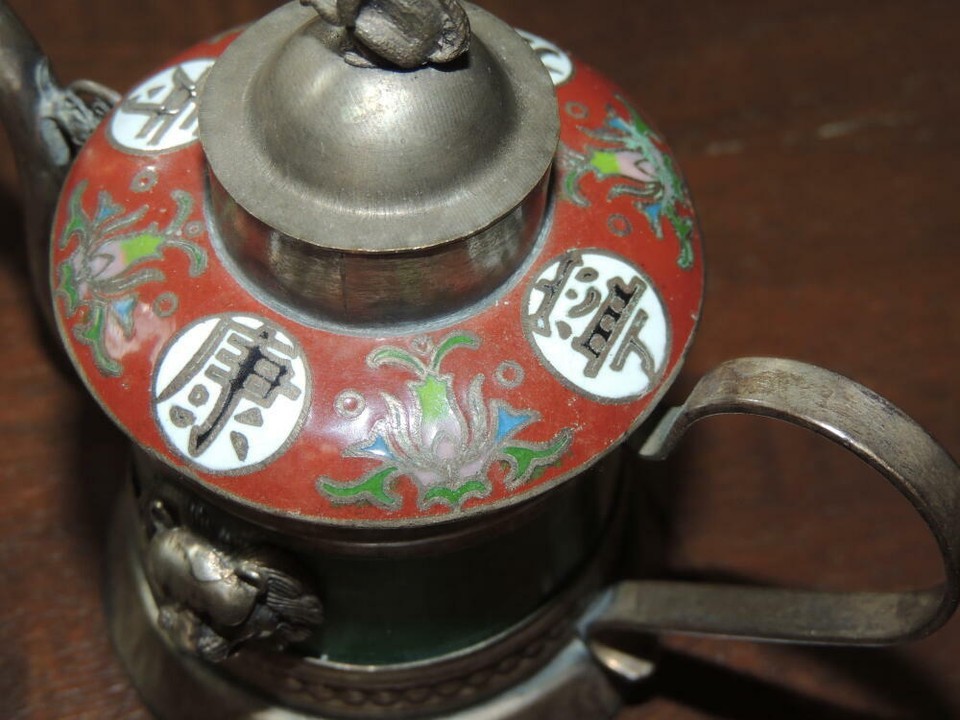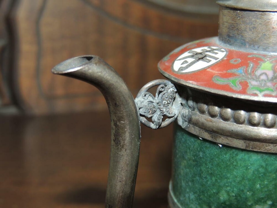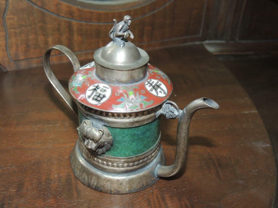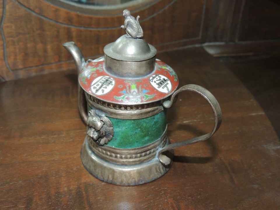 - Chinese Teapot marked lion monkey butterfly Green Agate Jade Jadeite Cloisonne