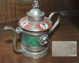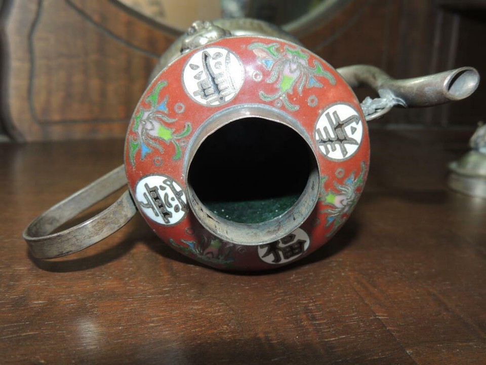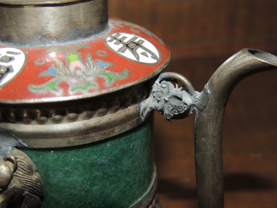 Chinese Teapot marked lion monkey butterfly Green Agate Jade Jadeite Cloisonne