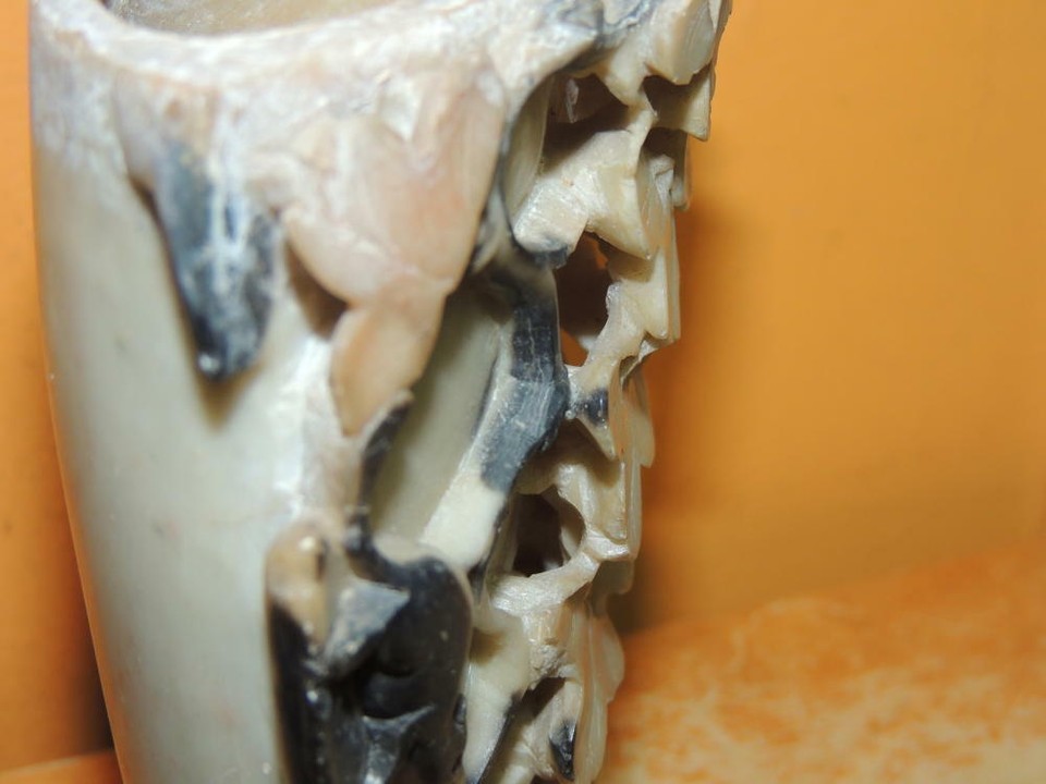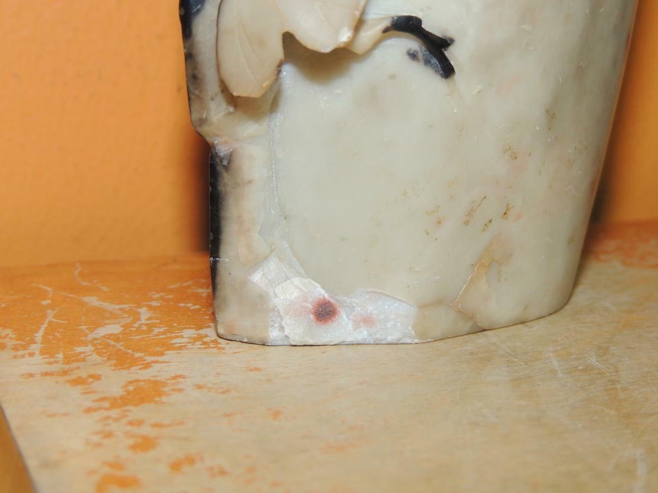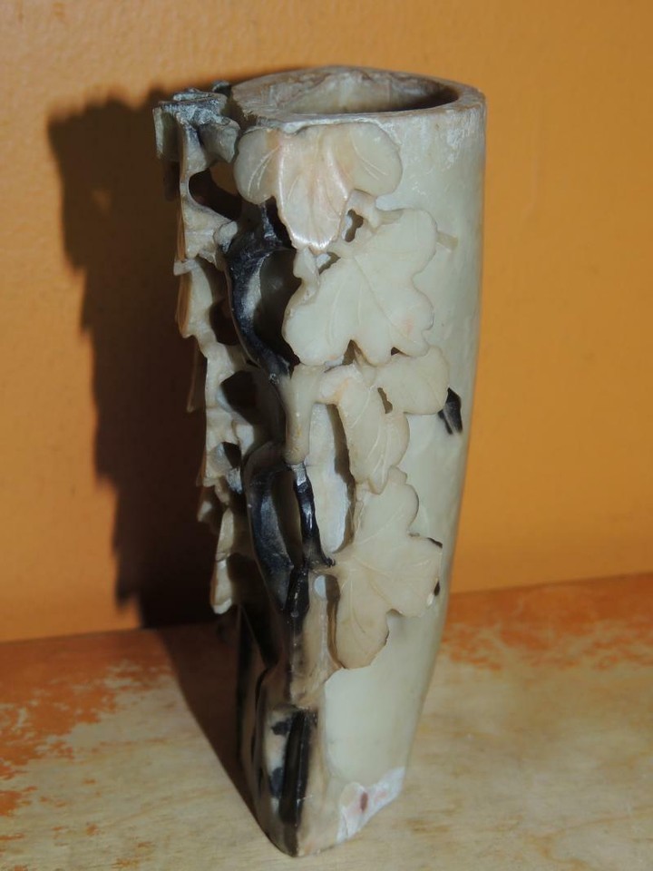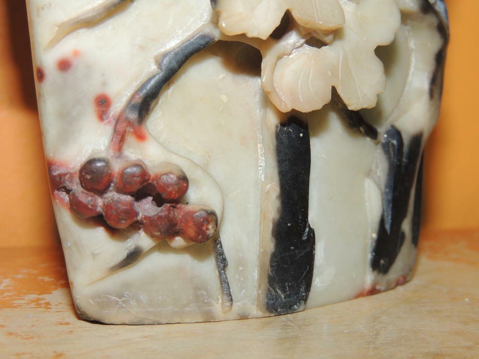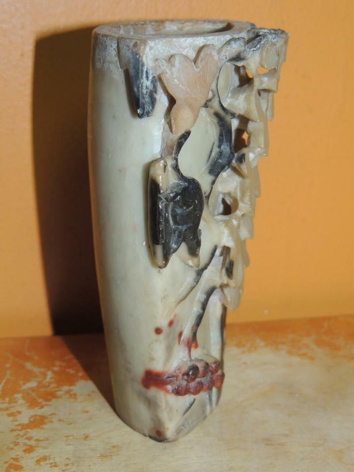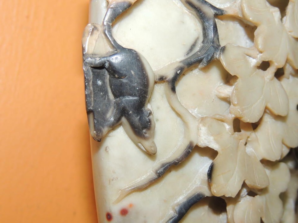 - Chinese stone 4.5" Brush Holder Carved marked Six grapevine rabbit Soapstone