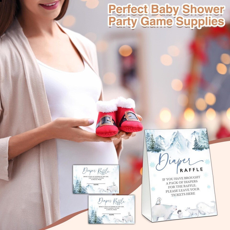 Baby Shower Game Set Size: Each Diaper Raffle standing sign measures 5 x 7 inches and the Diaper Raffle tickets measure 2.1 x 3.5 inches.