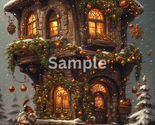 Step into a storybook winter wonderland with this enchanting Christmas cottage illustration. Nestled beneath a blanket of fresh snow, the charming stone-and-wood house glows with golden light from every window, inviting warmth into the crisp winter night. Evergreen garlands, twinkling lights, and shimmering ornaments drape elegantly over every balcony and beam, transforming the cottage into a festive haven. Snowflakes drift gently around the scene as Santa himself stands at the doorstep—bundled in rich, textured furs, carrying gifts, and radiating old-world Christmas charm. Surrounded by decorated pines and magical details, this artwork captures the heart of holiday nostalgia, making it a perfect piece for seasonal décor, greeting cards, prints, or anyone who wants to bring the magic of Christmas into their home.