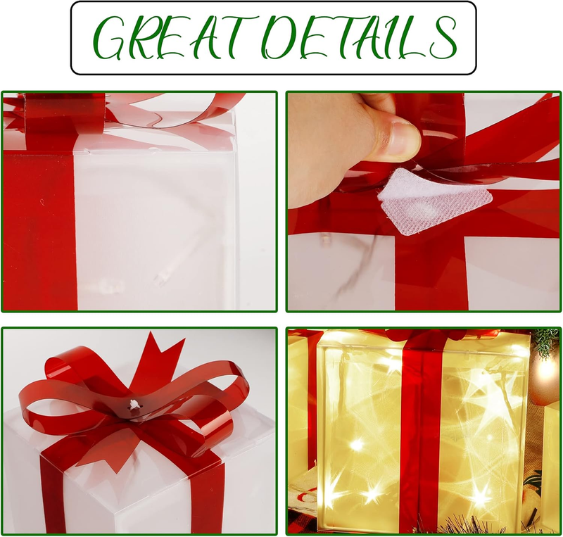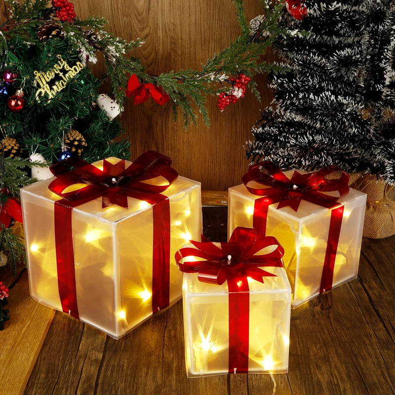 - Christmas Box Decorations, 60 Leds Light up Boxes with Red Bows, Plug-In Warm Wh