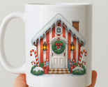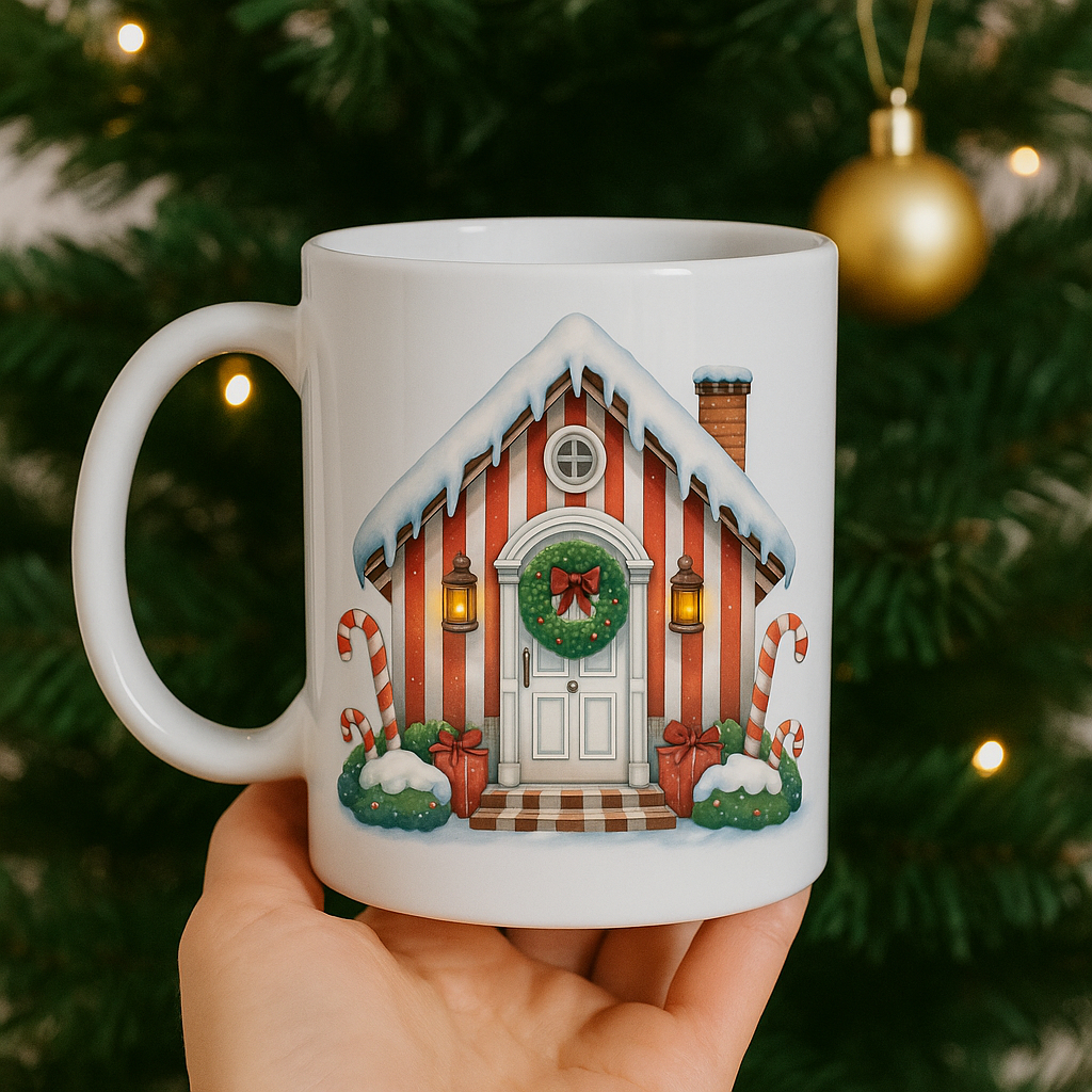 The artwork features a charming Christmas house with red-and-white candy stripes, a snowy roof, glowing lanterns, a festive wreath, candy canes, and holiday gift boxes. Perfect for creating: