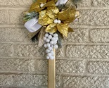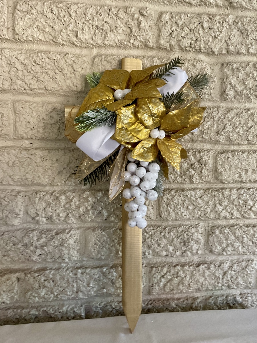 This 18” pine cemetery cross has been painted gold with two gold poinsettias, layers of fir branches, a group of white glitter berries, white ribbon, and gold ribbon. The cross has a pointed end for easy ground insertion. Every cross is sprayed with a coat of clear polyurethane to protect the ribbon and silk flowers from outdoor elements.