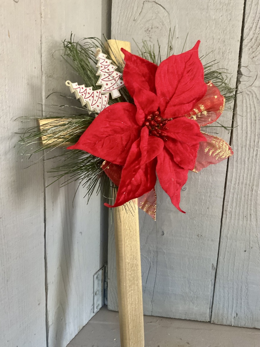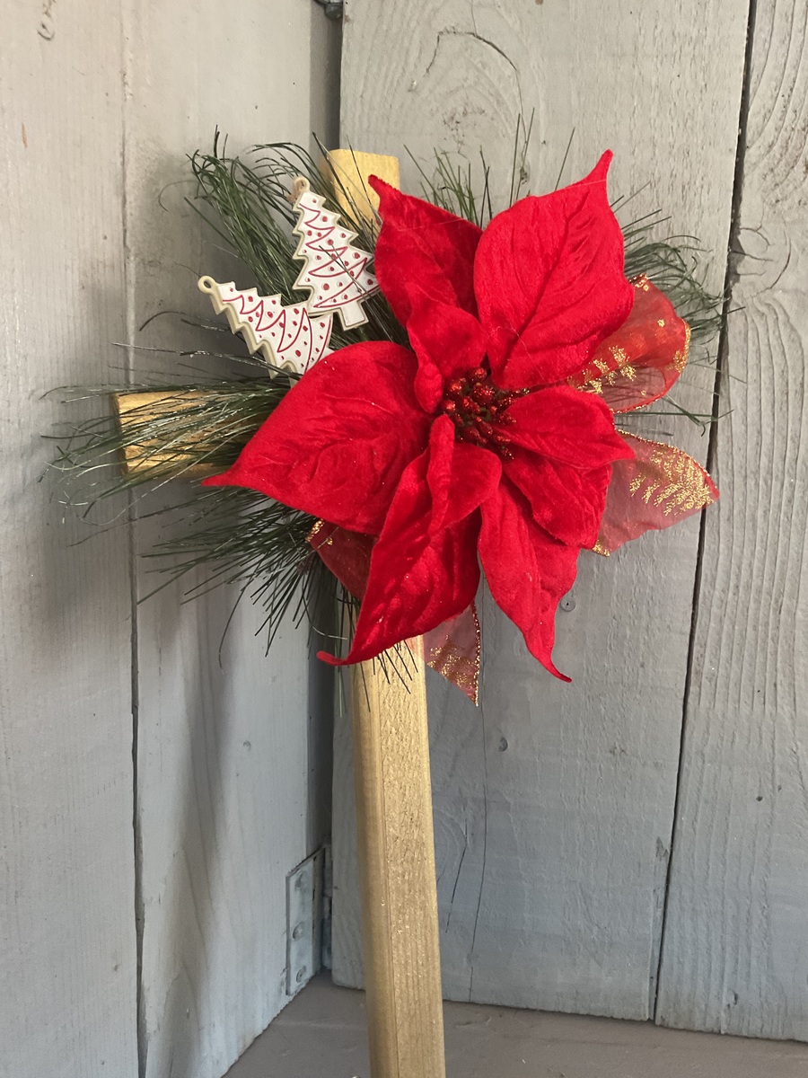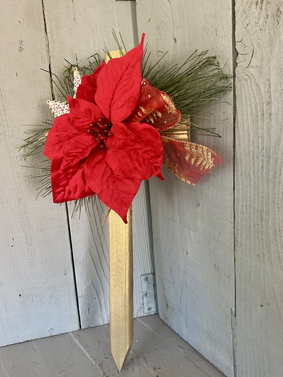 This 18” pine cemetery cross has been painted gold with a large red velvet poinsettia, two Christmas tree picks, fir branches, and red and gold Christmas ribbon. The cross has a pointed end for easy ground insertion. Every cross is sprayed with a coat of clear polyurethane to protect the ribbon and silk flowers from outdoor elements.
