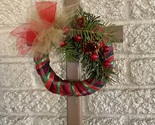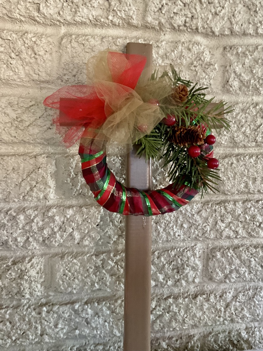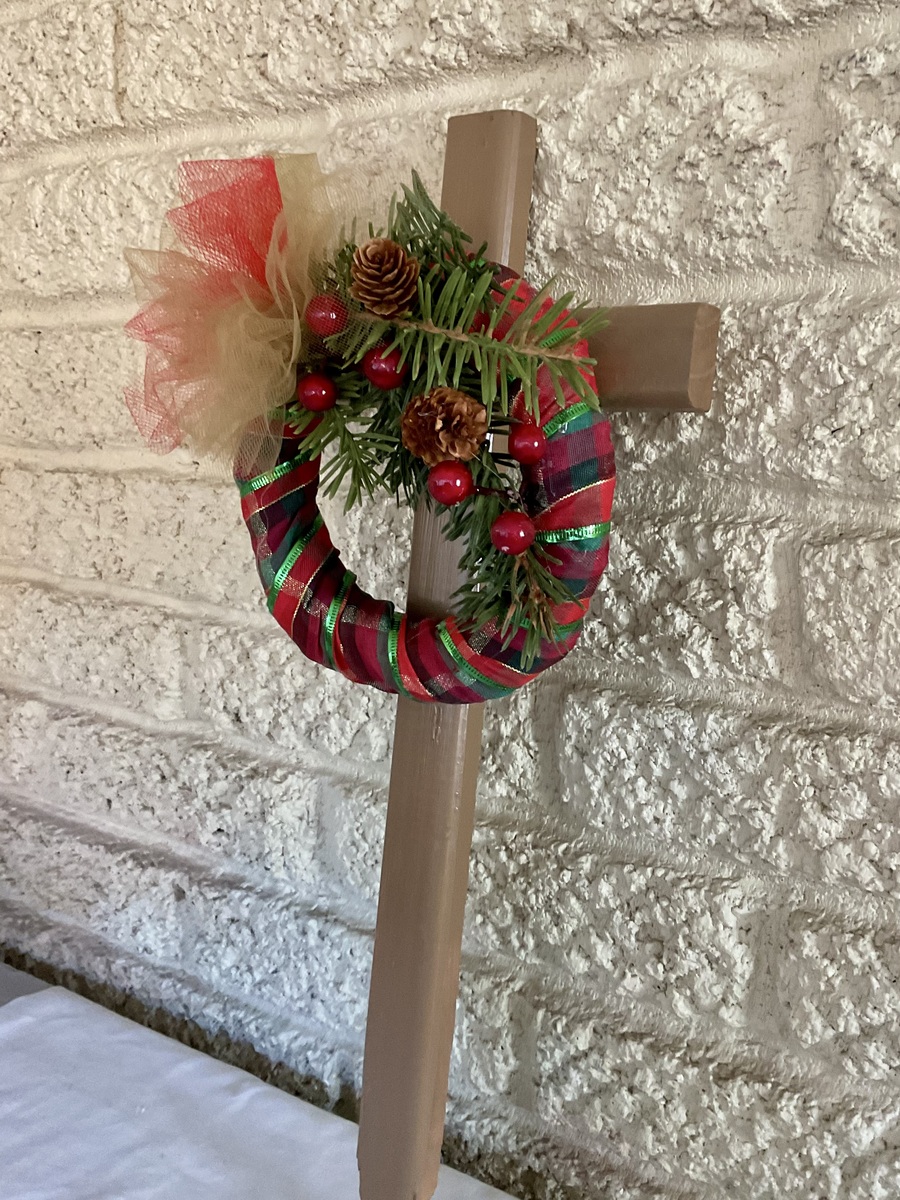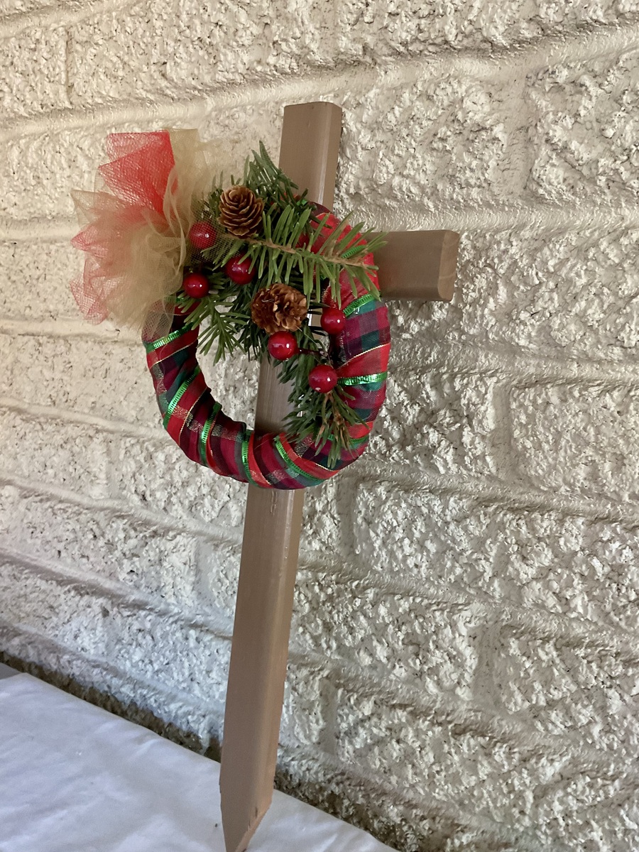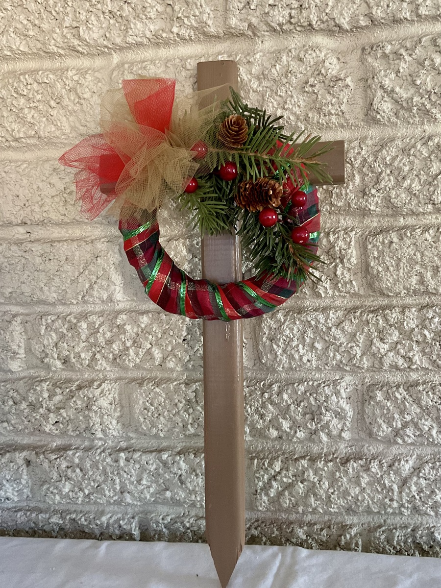 This 18” pine cemetery cross has been painted gingerbread brown with a Christmas ribbon wrapped mini wreath attached to the front. The wreath has fir branches , red berries, mini pine cones, and gold / red tulle. The cross has a pointed end for easy ground insertion. Every cross is sprayed with a coat of clear polyurethane to protect the ribbon and silk flowers from outdoor elements.