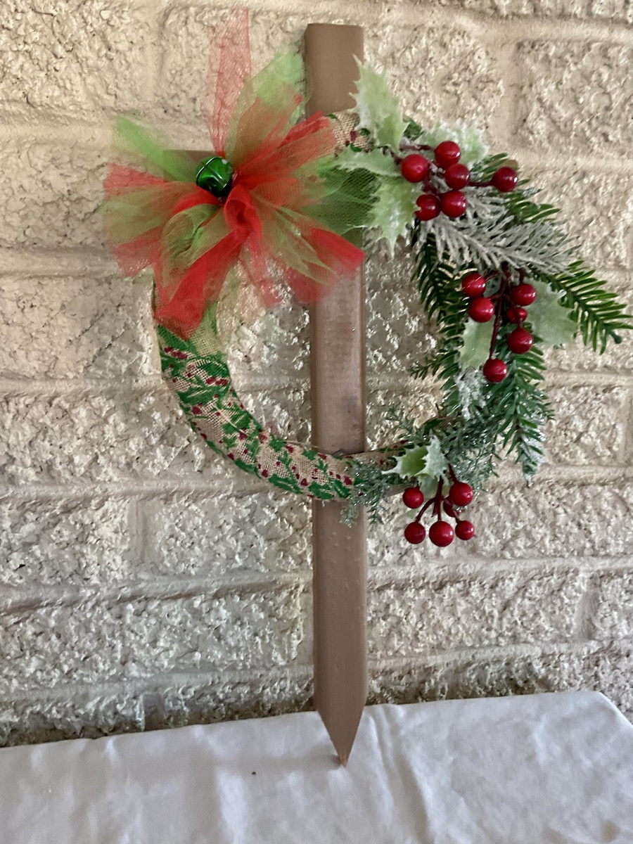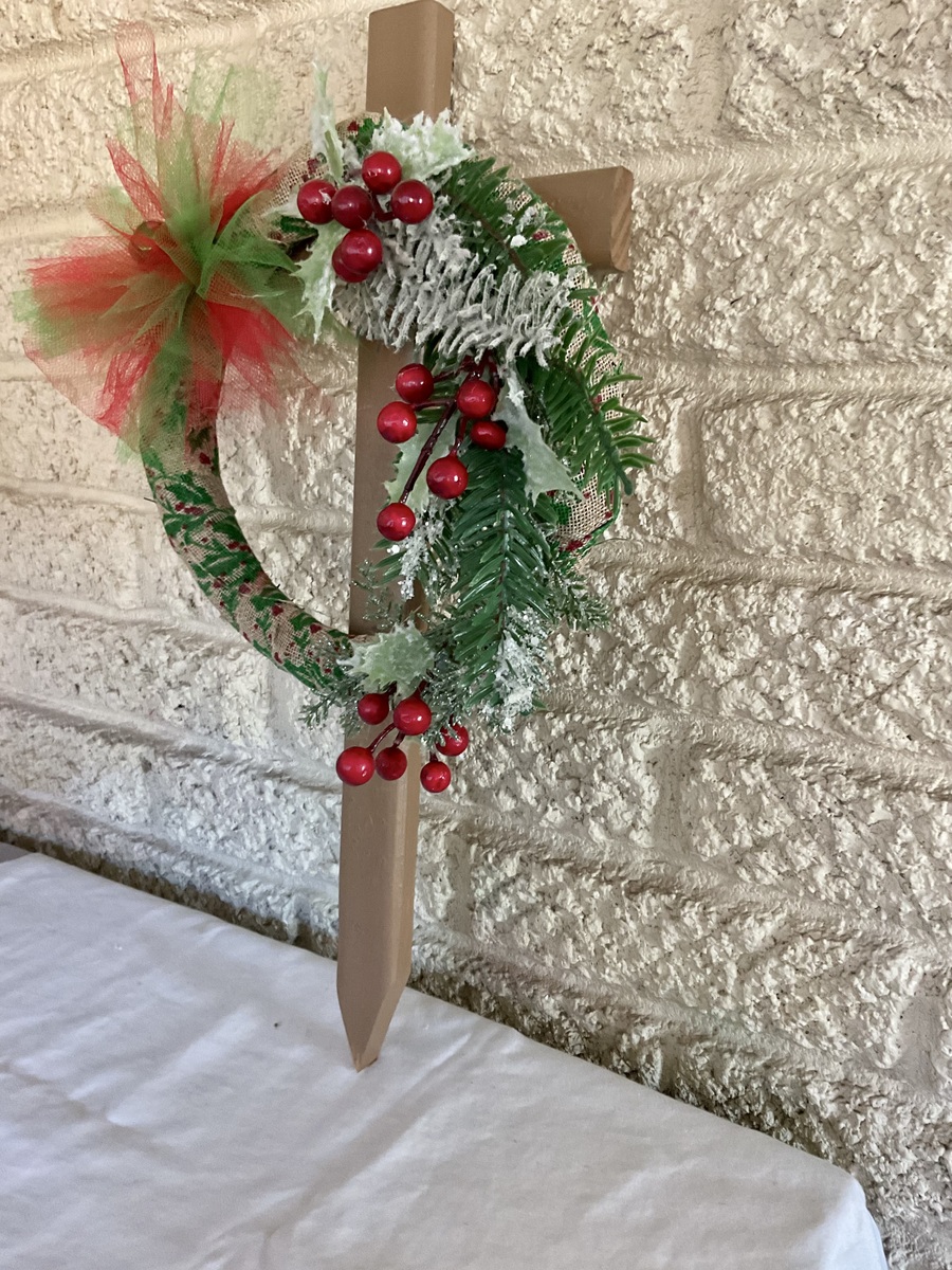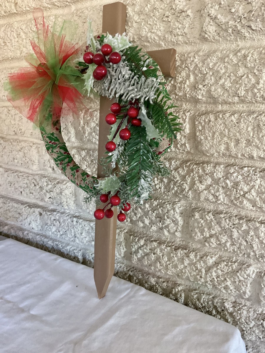 This 18” pine cemetery cross has been painted gingerbread brown with a Christmas ribbon wrapped wreath attached to the front. The wreath has fir branches, bunches of red berries, a green bell is in the center of a bow made from green and red tulle. The cross has a pointed end for easy ground insertion. Every cross is sprayed with a coat of clear polyurethane to protect the ribbon and silk flowers from outdoor elements.
