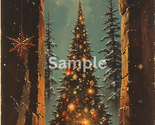 Step into a nostalgic winter wonderland with this enchanting vintage-style Christmas illustration. Framed by the warm, weathered stone of an old archway, a majestic Christmas tree stands illuminated in the snowy forest beyond. Golden and red ornaments shimmer against deep evergreen branches, while a radiant star crowns the tree, casting a soft, magical glow across the quiet winter night.
