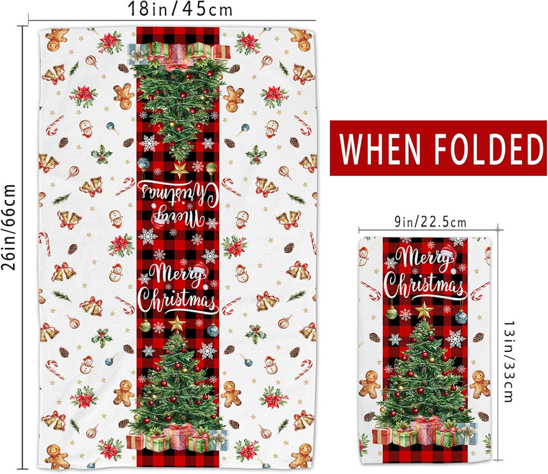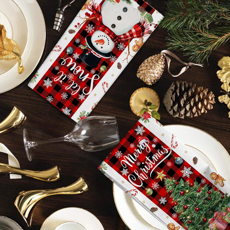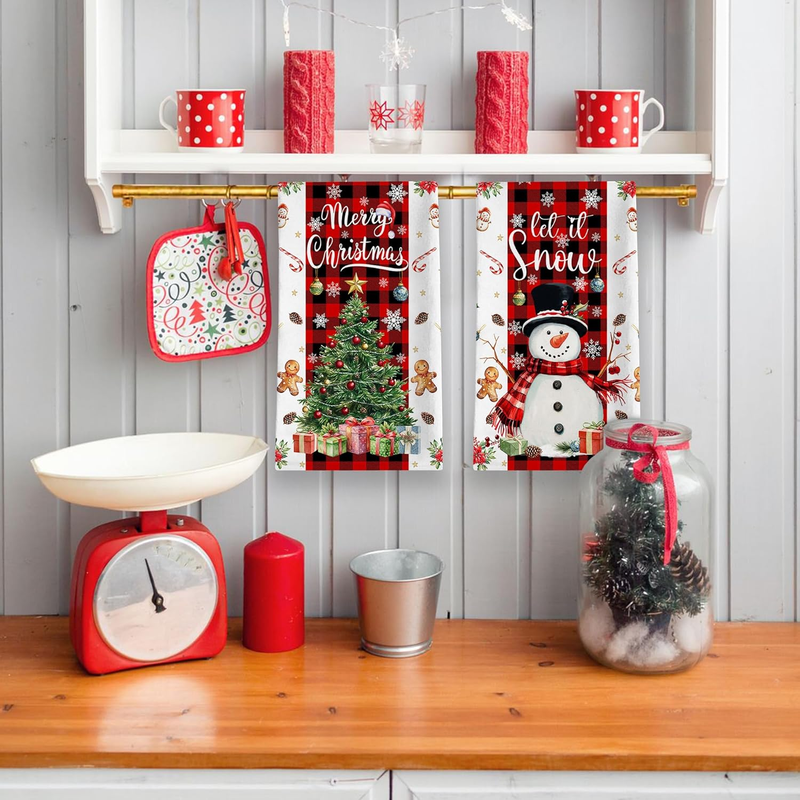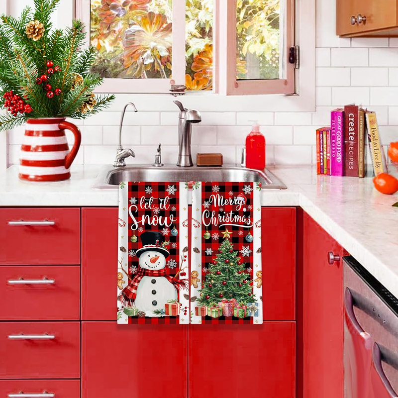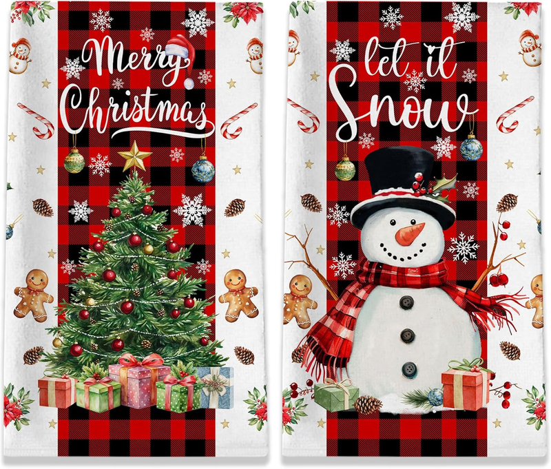 Christmas Kitchen Towels, Merry Christmas Tree Towels Set of 2, Farmhouse Snowman Let It Snow Dish Hand Towels with Red Black Buffalo Plaid, Winter Decorations for Home, 18X26 Inches
