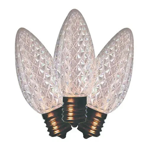 These C9 LED replacement bulbs are used by homeowners, property managers, and lighting professionals to maintain or upgrade existing holiday light displays without replacing entire strings. Commonly installed in outdoor roofline cords, commercial signage, or large tree wraps, they restore brightness and reliability to legacy C9 systems. The pure white faceted design ensures high visibility and a classic holiday look, while the 50,000-hour lifespan makes them cost-effective for both seasonal and year-round use?such as in municipal displays, retail facades, or permanent landscape lighting. Ideal for those seeking a direct-fit, energy-saving alternative to incandescent bulbs, they deliver consistent performance, safety, and durability with minimal maintenance.