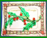 This is a VINTAGE Green Holly Sprig Pin. This also has 7 enamel Red Holly Berries. Great/Excellent condition. No tarnish or wear on this pin. Doesn't look like it's been used.