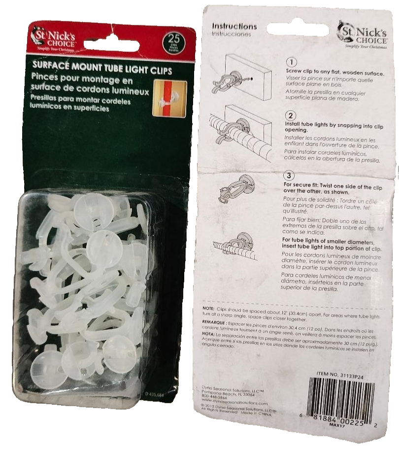 - 25-count clear plastic clips for 1/2-inch rope light strands
