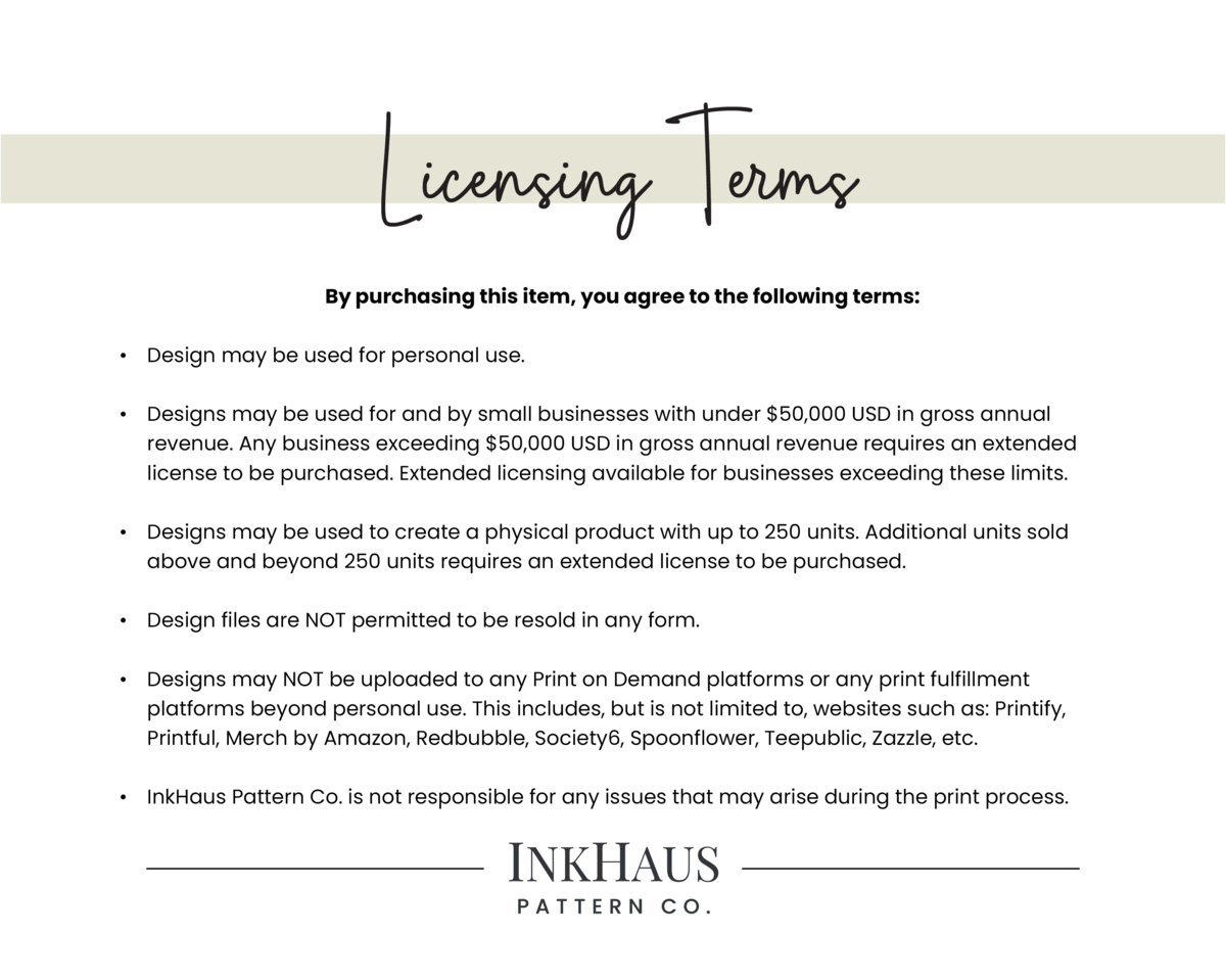 Copying or reselling designs is prohibited. Every design including its individual elements are created by and is property of InkHaus Pattern Co. Copyright InkHaus Pattern Co. All rights reserved.