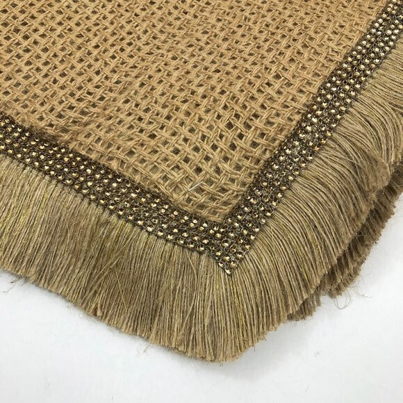Christmas Tree Skirt, Natural Jute Burlap Color and design with Jewel Like Trim and fringe 54x54 inches square. Elegant and simple natural Jute Burlap material Christmas Tree Skirt. With metal jewel like edging and fringe all the way around. Spot Clean Only.