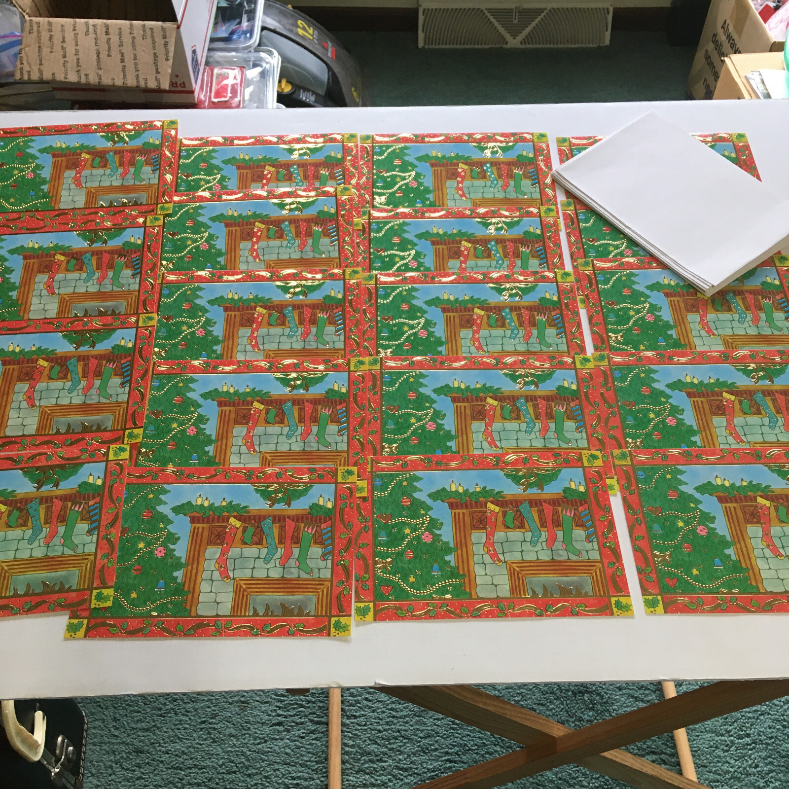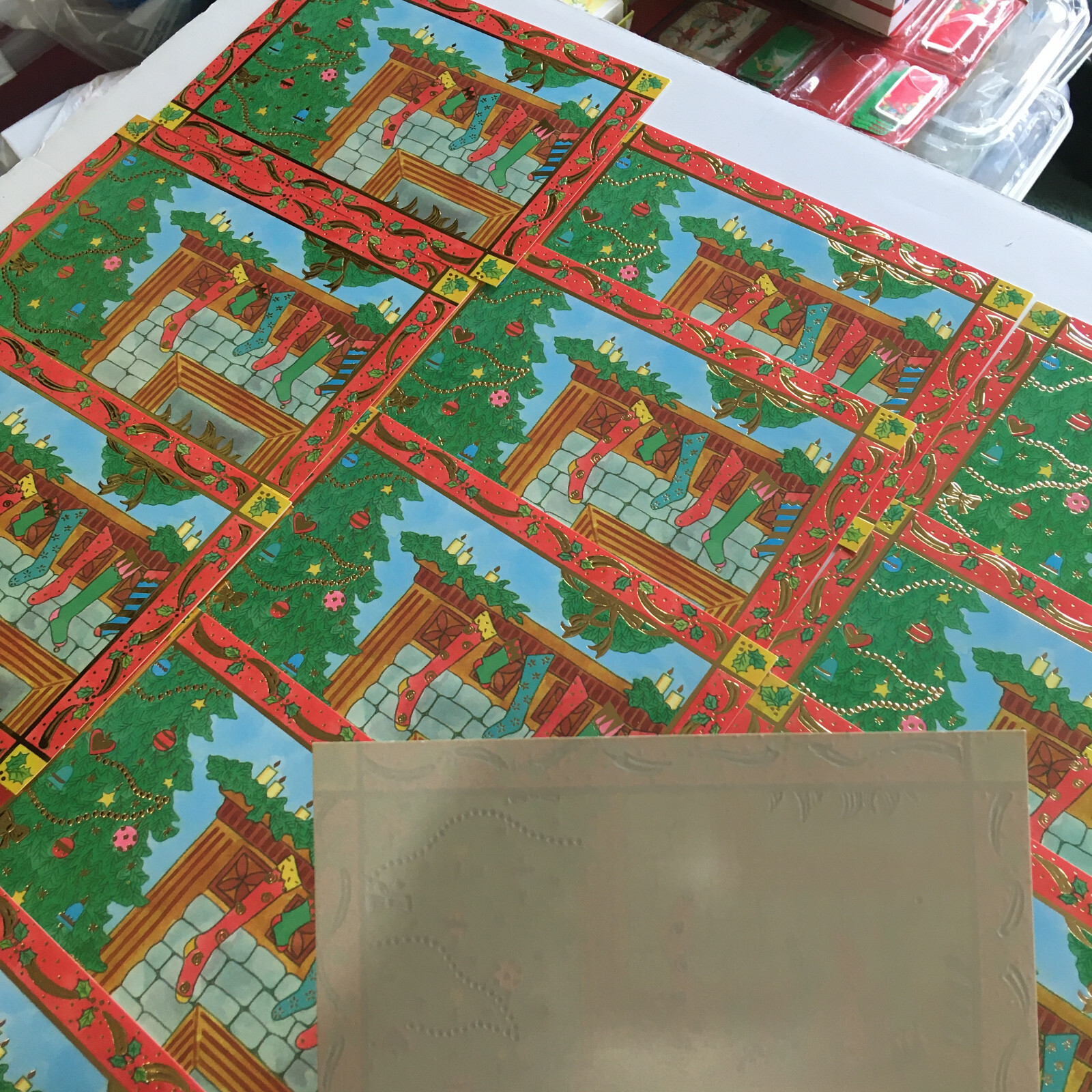 Christmas holiday vintage unused greeting cards tree with stockings on mantel