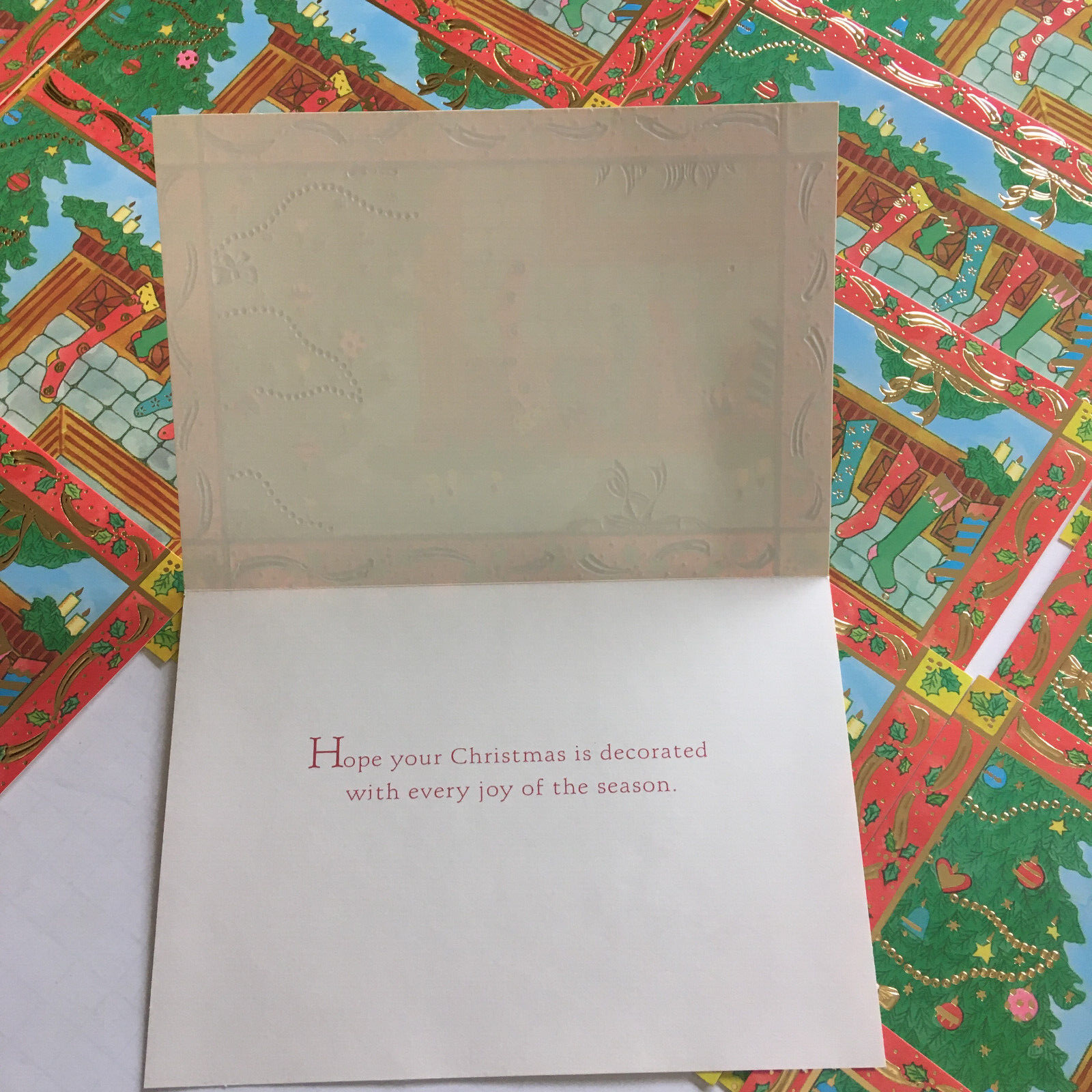 - Christmas holiday vintage unused greeting cards tree with stockings on mantel