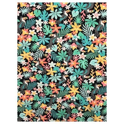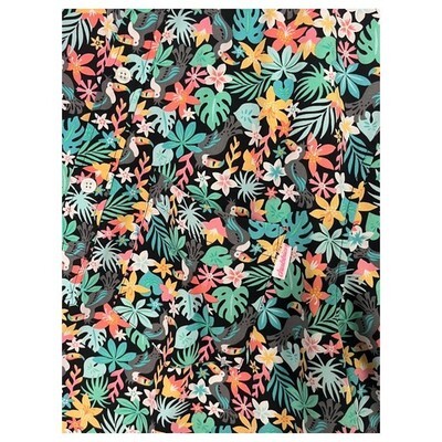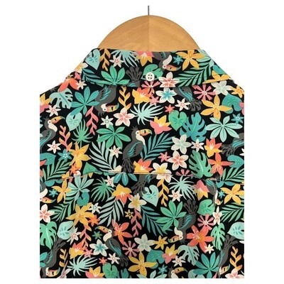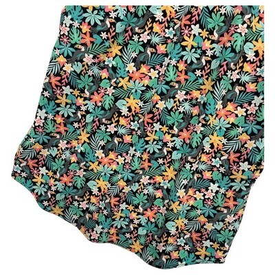 Pattern/Color: Allover tropical print on black with multicolor leaves and flowers featuring toucans (vibrant teal, green, coral, pink, yellow)