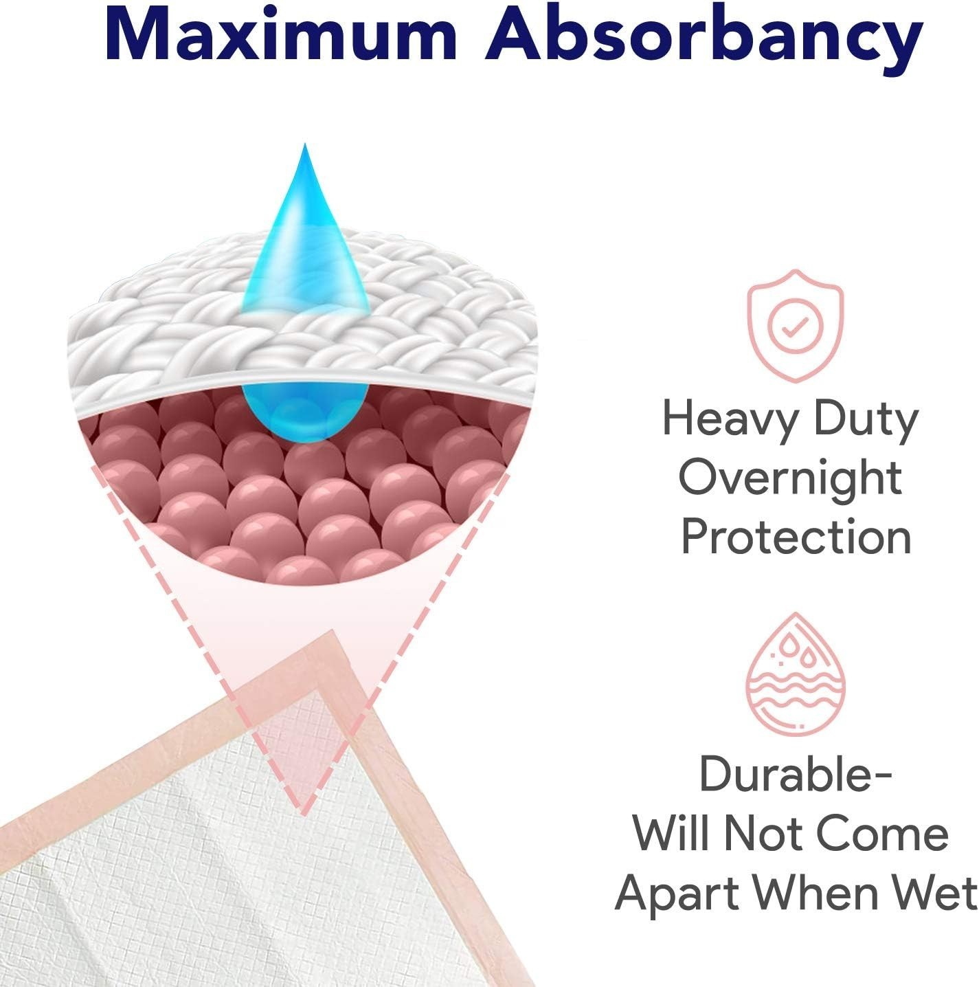 OVERNIGHT PROTECTION: Designed for heavy absorbency, these disposable underpads can hold a large amount of liquids, enough for over night protection. Durable even when wet, the layers won't separate.