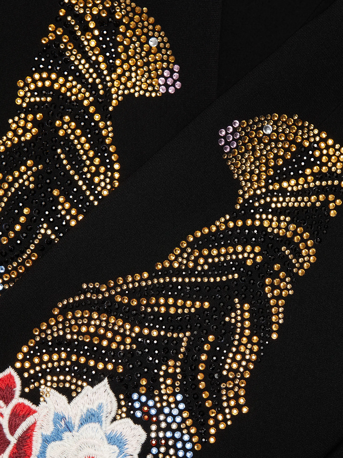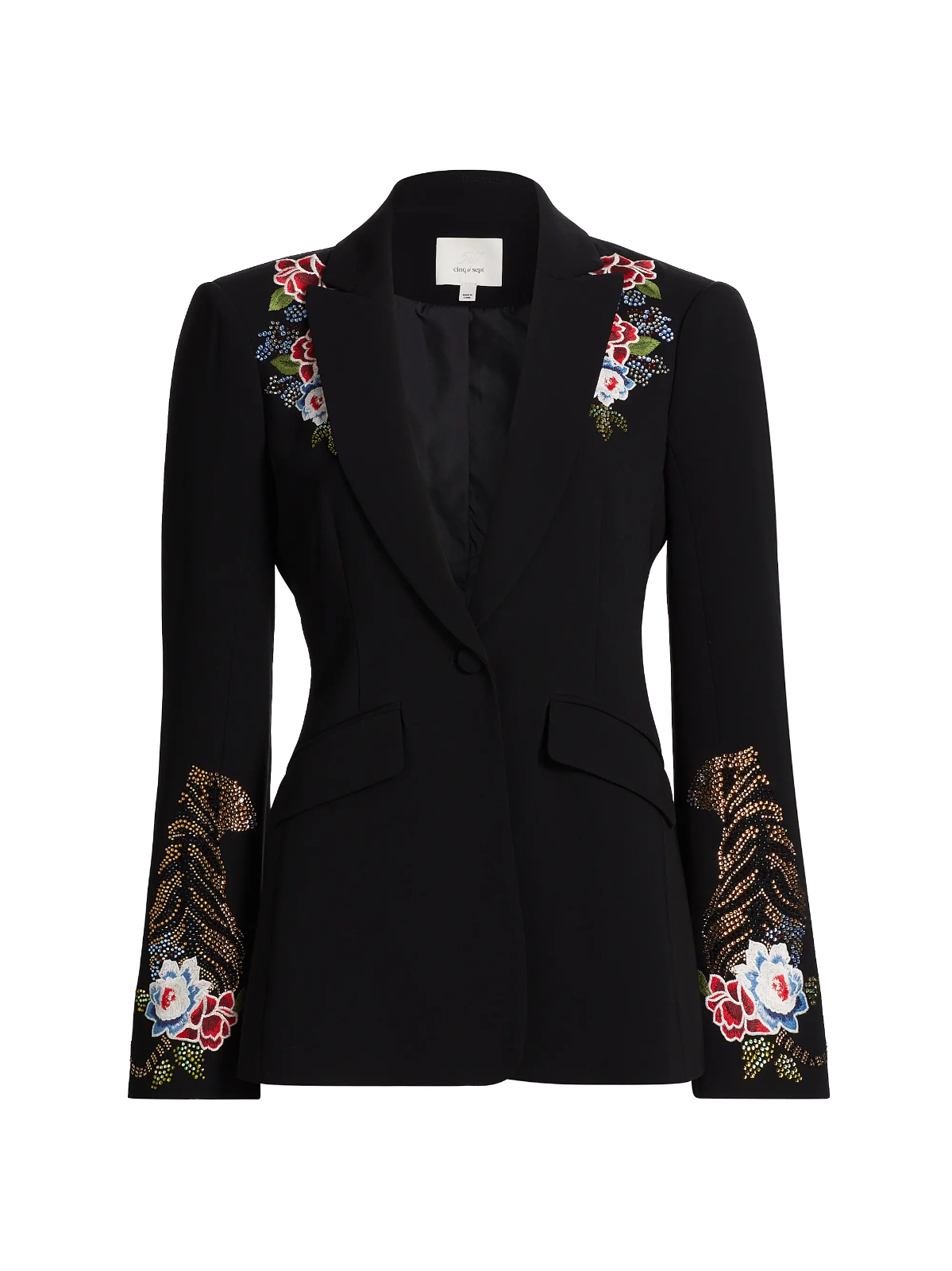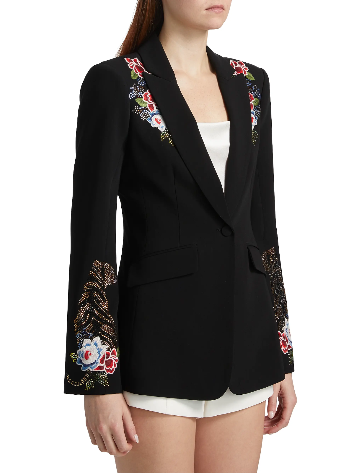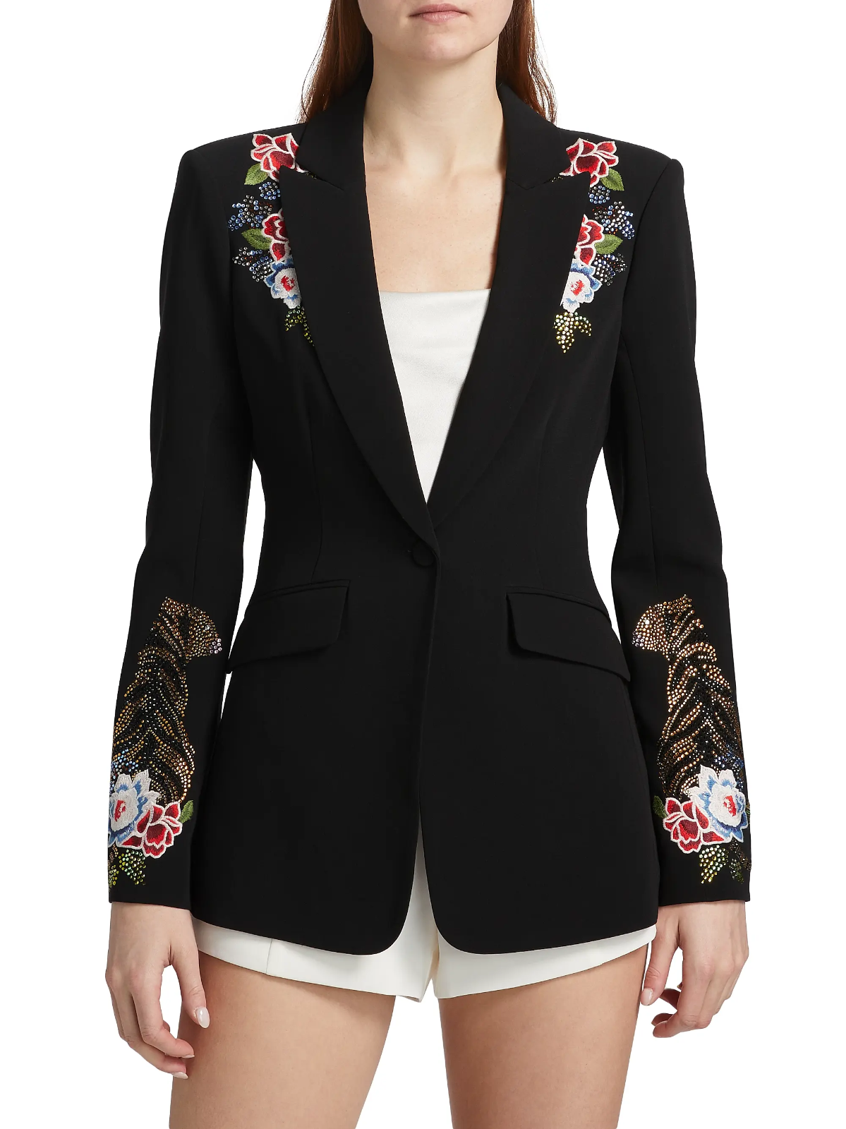 This Le Beau Tigre Cheyenne blazer from Cinq a Sept combines tiger and floral embroidery with heatset crystal embellishments, elevating a classic staple into a statement piece.