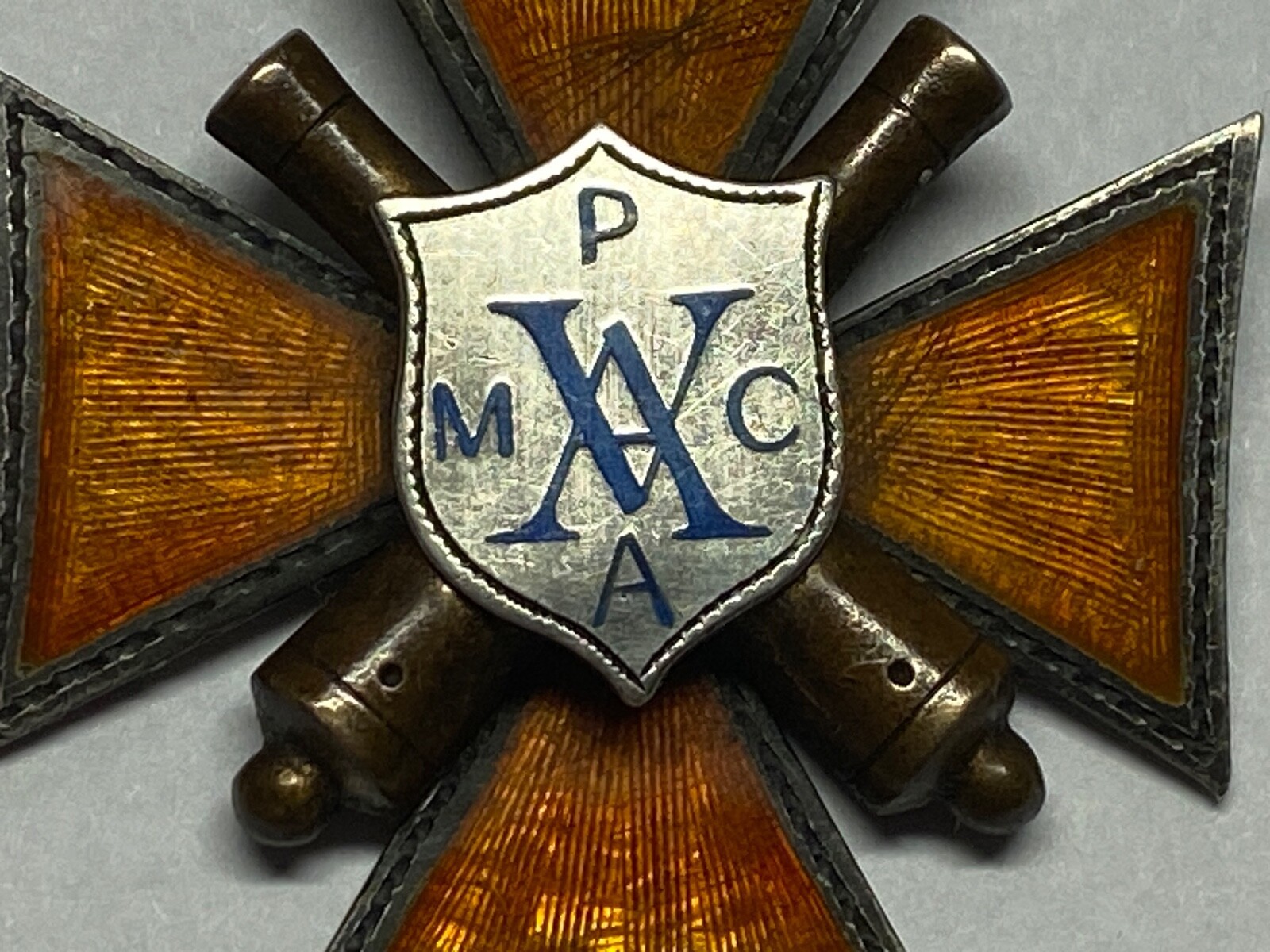 The Providence Marine Corps of Artillery Badge 1801-1874 . This is a beautiful, well made, multi-piece, pinback. No chips to the enamel.
