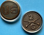 Grouping consists of a U.S. Collar Disk and an 2nd Infantry Regiment, G Company, Collar Disk, Both are Type I, Enlisted. Both thumb screws are intact. Measures approx. one inch in diameter. Screw backs.
