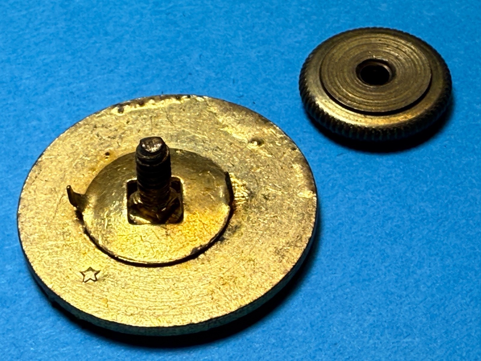 Thumb screw is intact. Measures approx. one inch in diameter. Screw back.