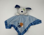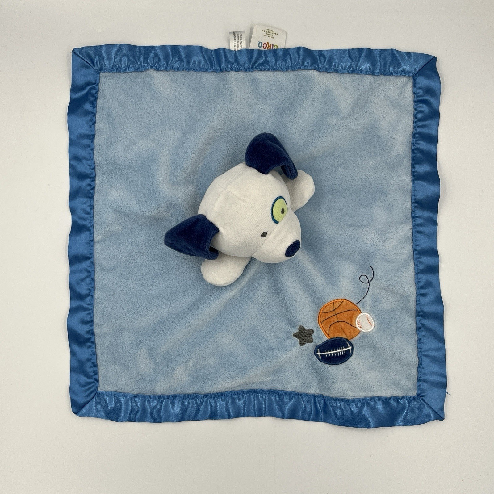 Adorable Circo puppy dog lovey/security blanket featuring a white and blue puppy plush head with embroidered details. The blanket is light blue with a satin trim and embroidered sports balls (basketball, football, baseball, and star). Perfect as a comfort item or replacement lovey for your little one.