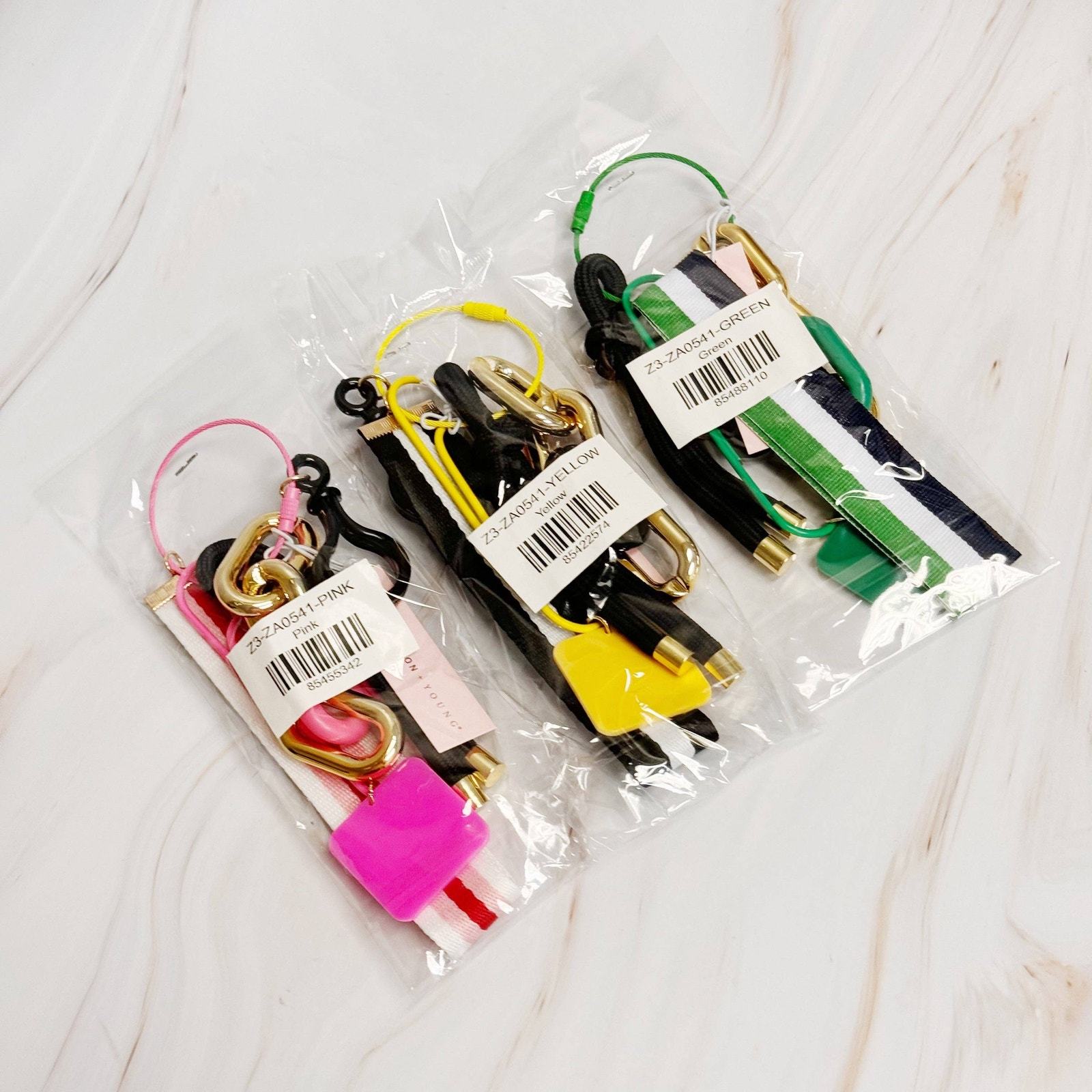 Introducing the City Hip Jingle Key Chain - a trendy and playful 7"accessory with multiple functions. With a wrist strap and screw locking ring, this key chain is perfect for keys or as a stylish addition to your bags. Each key chain features a unique combination of colors and elements, making it a fun must-have for keys and decor.