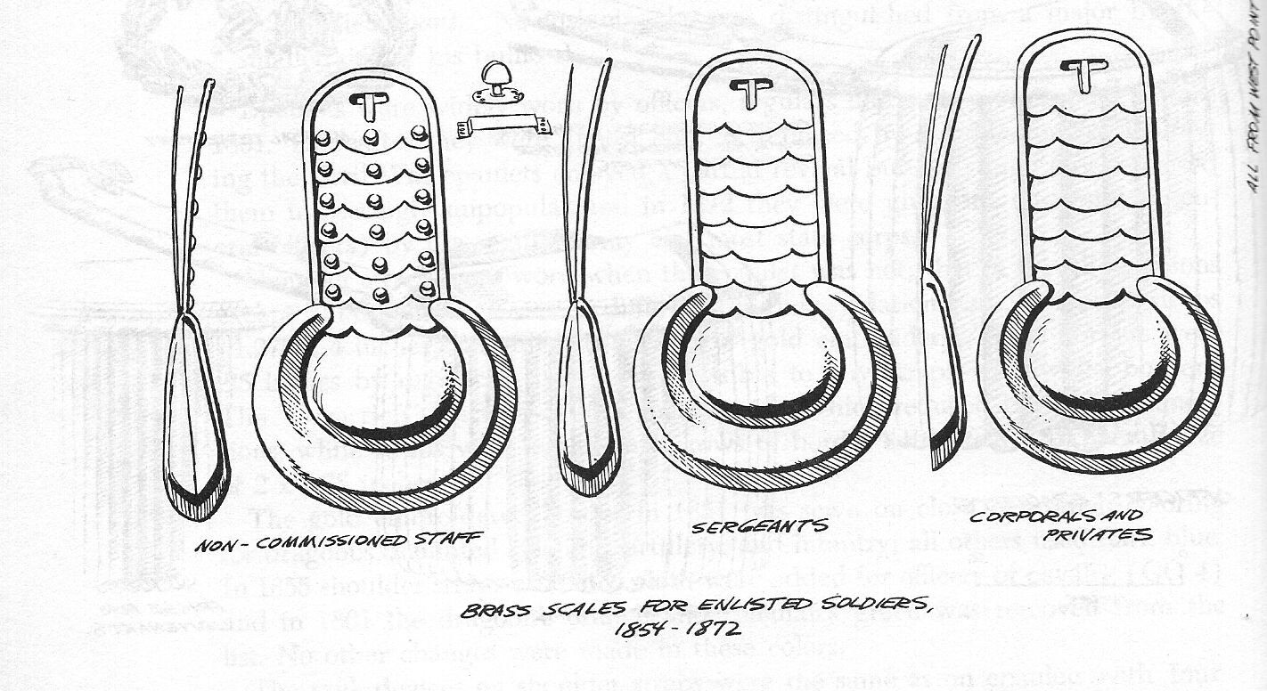 Brass scales, officially called "metallic scales", but often seen in Quartermaster correspondence as "shoulder scales " (brass)" (nicknamed 'frying pans') were issued to other enlisted men in addition to cavalry starting in 1854. Up to that time the scales were only issued to mounted troops. From 1851 to 1855 the shoulder scales were issued in to styles, one for non-commissioned officers staff personnel and one for dragoons and light artillery. In 1854-1872 they came in three styles, one for staff non-commissioned officers, one for sergeants and one for privates. This is a pair of private?s scales, with the brass half-crescents (sergeants had top and bottom sections) and separate, but plain, scales along the shoulder strap portion (non-commissioned staff had the full crescent and visible rivets along the top.)