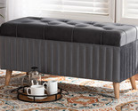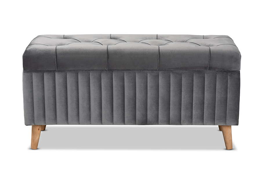 - Clairette Gray Velvet Fabric Upholstered and Walnut Brown Storage Ottoman