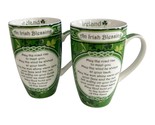 Pair of matching ?An Irish Blessing? mugs from the Shamrock Garden collection by Clara. Each features a bright green Celtic knot and shamrock pattern with the traditional Irish Blessing poem. Made of new bone china and designed for both beauty and function, these mugs capture classic Irish charm and are perfect for daily use or display.
