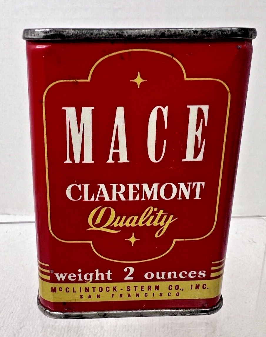 Claremont Quality Mace Spice Tin McClintock Stern Co San Francisco 2 oz just over 3 1/4 tall x 2 1/4 x 1 1/4 In good shape yes, some wear to the paint but overall so nice
