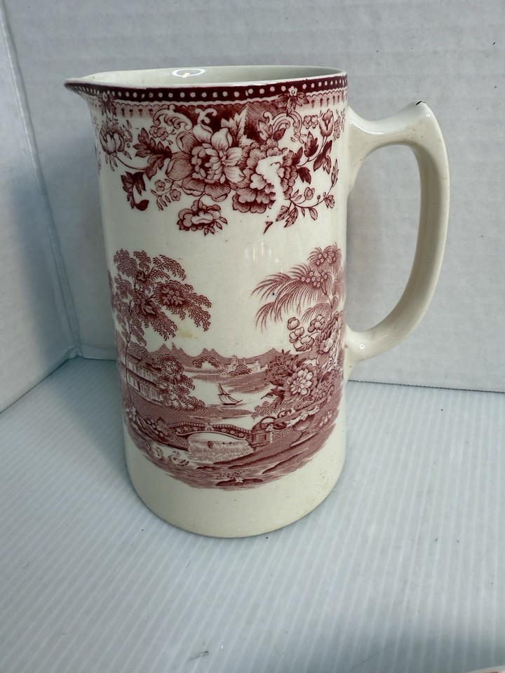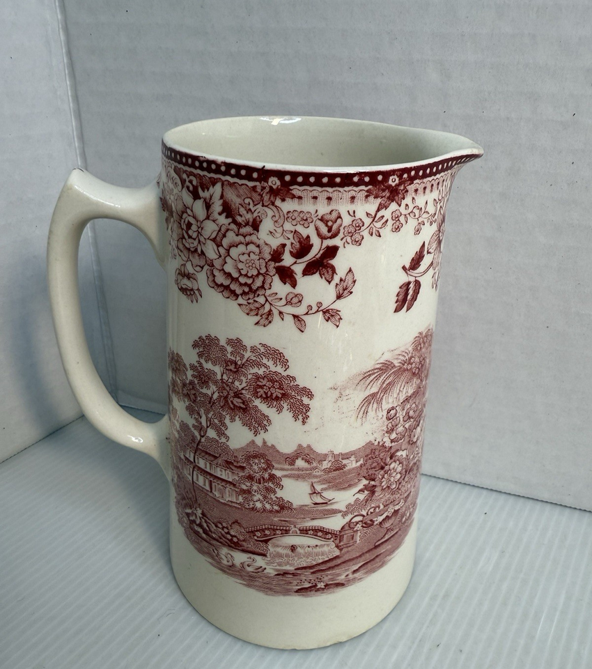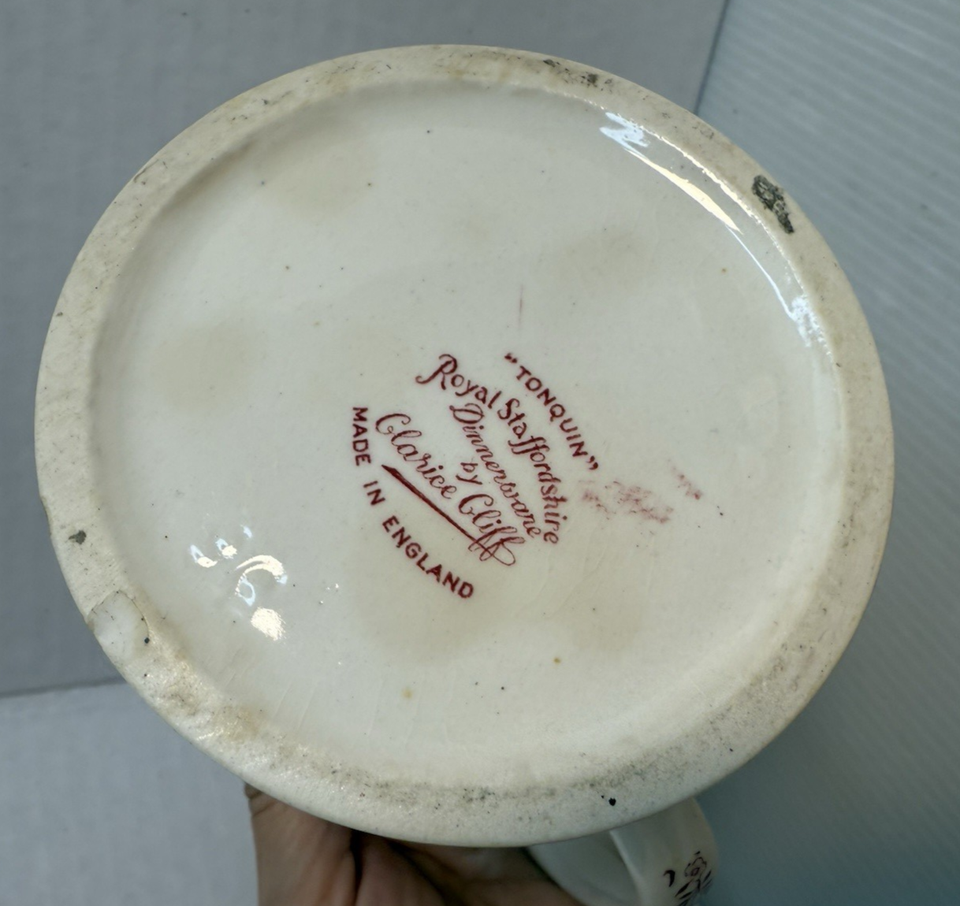 This product is a 5-piece lot of pink and red Clarice Cliff Tonquin Royal Staffordshire bone china pitcher sets. Each set includes a pitcher and four matching cups, all adorned with the characteristic pink and red floral design. Crafted in Staffordshire, England using traditional pottery techniques, these pieces are a luxurious addition to any dining or serving collection. Made in China, these fine china pieces showcase the talent and craftsmanship of Clarice Cliff and her iconic designs.