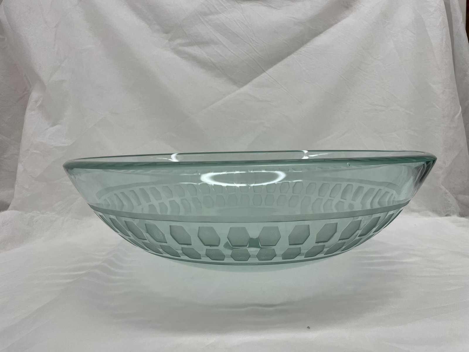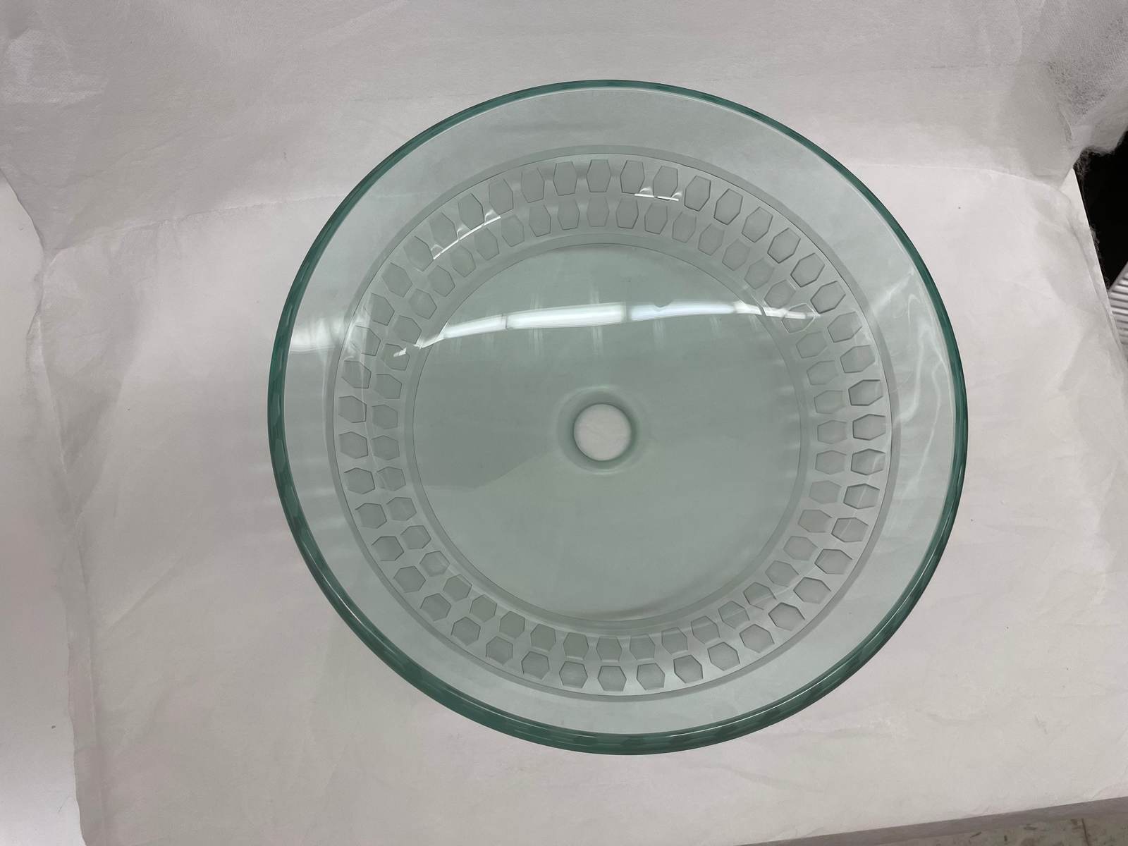 - Clear Glass Vessel Sink Carved Pattern Unique Bonus Pop Up Drain in Chrome finis