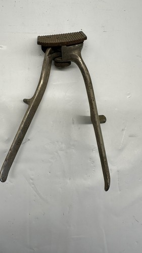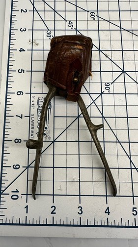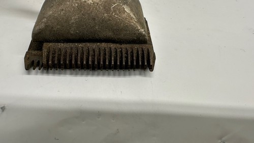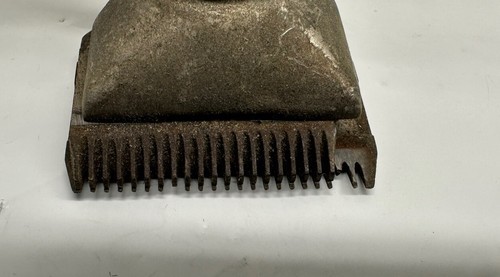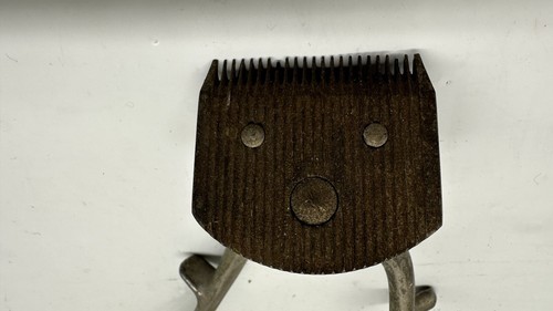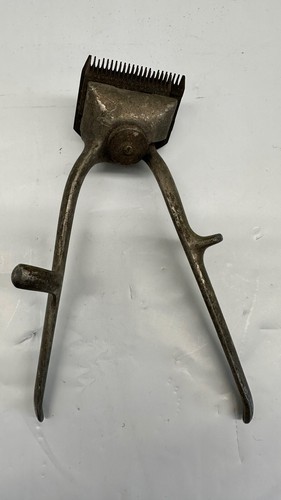 The item is an antique clipper set that includes a leather case and a stamped shaver. This antique vanity collectible is likely a grooming tool used for shaving purposes. The presence of a leather case suggests that the set was meant for storage and possibly for travel, adding to its aesthetic and functional appeal as a piece of history.