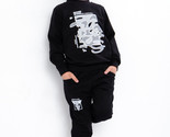 The boys' sports suit is made from high-quality double-thread fabric. The set includes a stylish hoodie with a hood and comfortable pants. The hoodie features a hood and wide elastic cuffs on the sleeves and bottom. The pants have a comfortable waistband and two side pockets. Both the hoodie and pants are adorned with a modern printed design. This suit is perfect for everyday wear, sports activities, or active outings. The high-quality material ensures durability, and with proper care, the suit can be worn for several seasons. It may shrink slightly after washing.