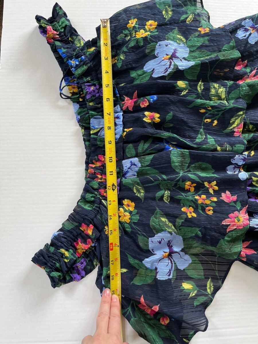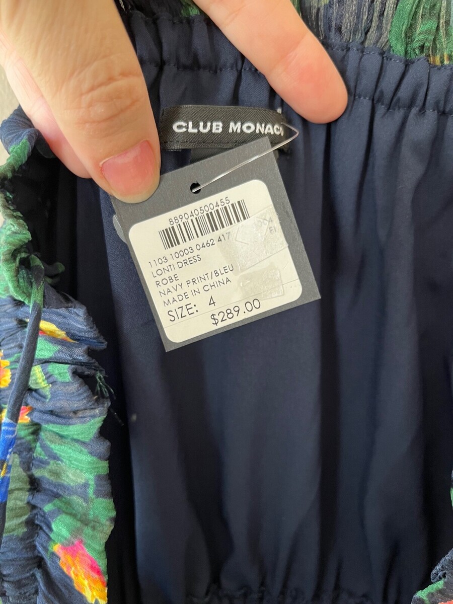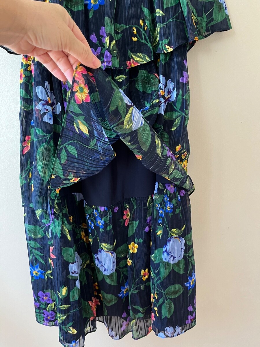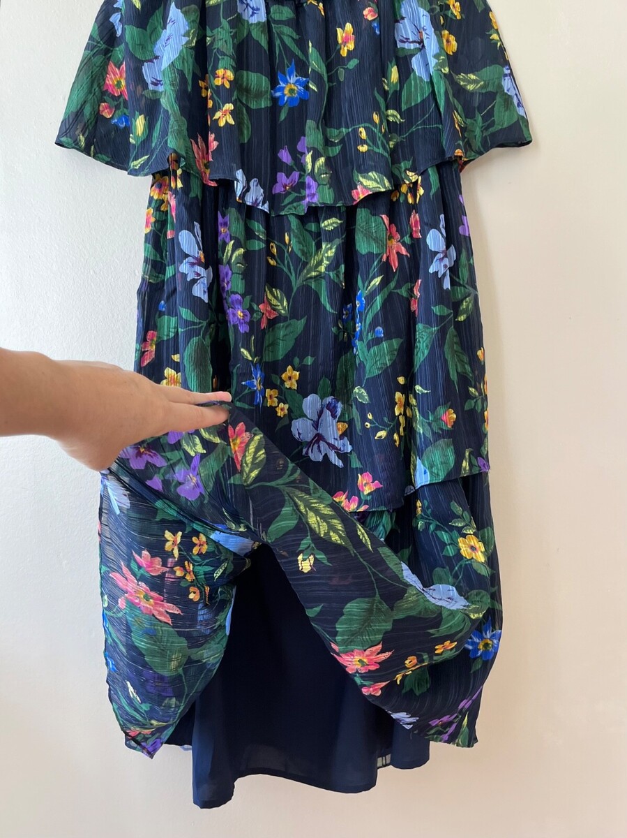 - Club Monaco Oversized Silk Lined Tiered Floral Stretch Navy Dress, Size 4 or 6