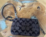 Brown Coach wristlet clutch featuring the signature Coach 'C' pattern.
