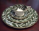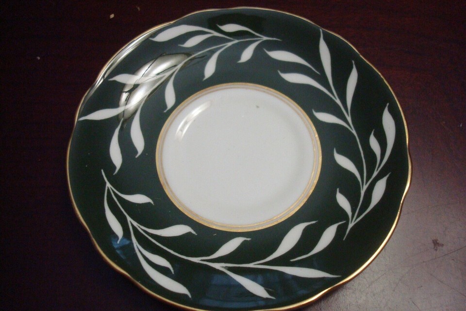 Coalport England china set 4 pcs set "Phantom Green", dinner plate is 11" diam, salad plate 8", saucer is 6" and cup is 2" tall by 4" diam, very good condition, some light surface scratches commensurate with age [CARLYLEBASKT2]