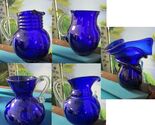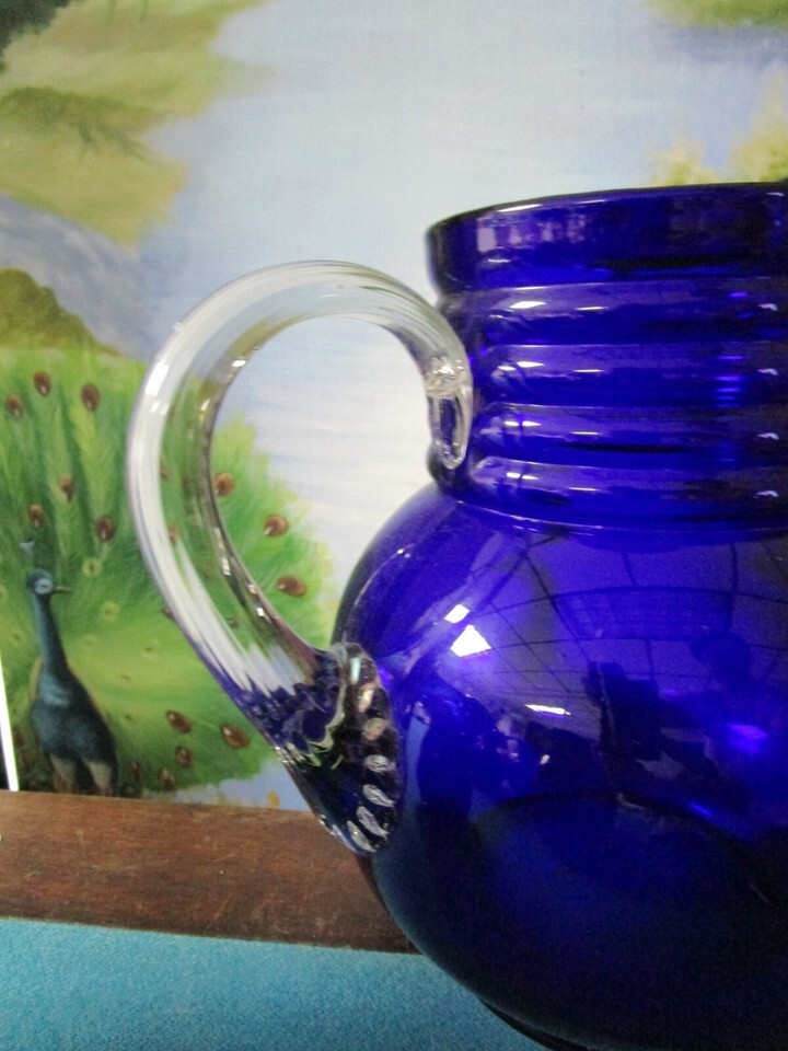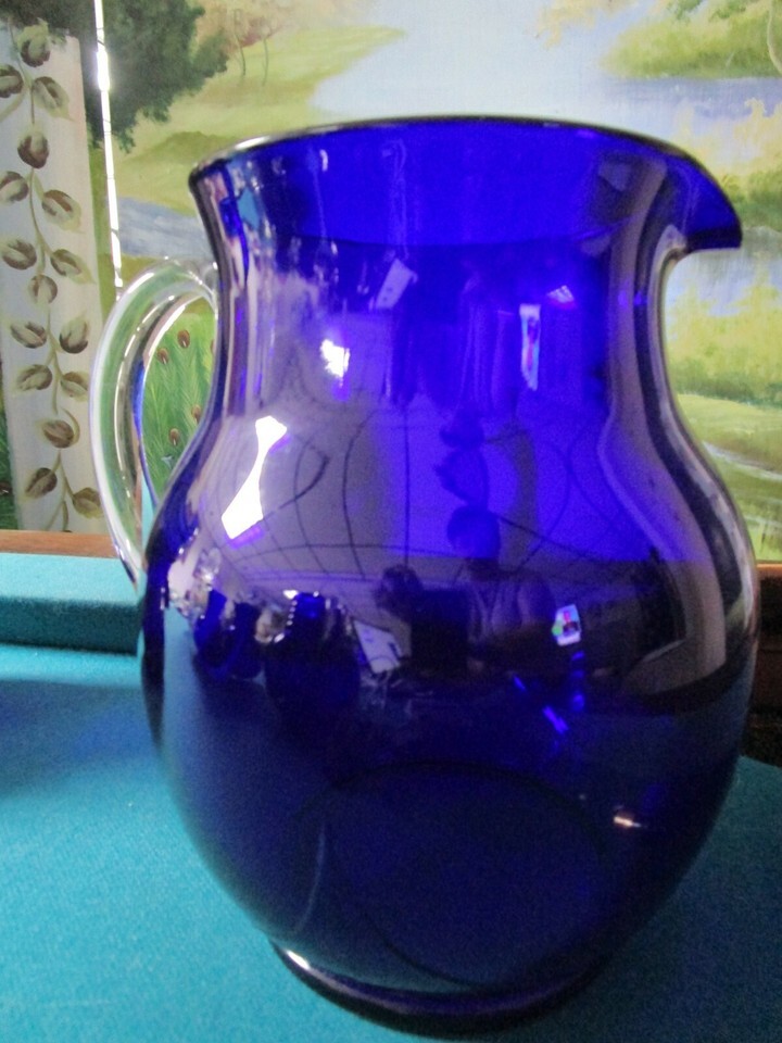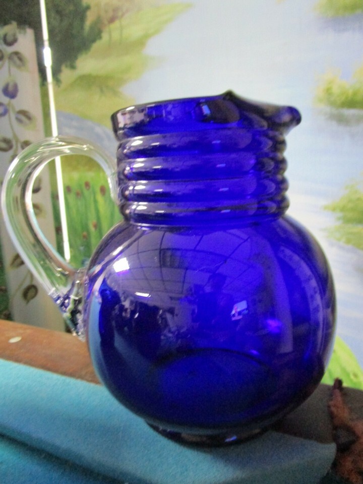 2- 9 X 7 VINTAGE COBALT BLUE GLASS PITCHER CLEAR HANDLE [outbackrack5top]