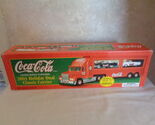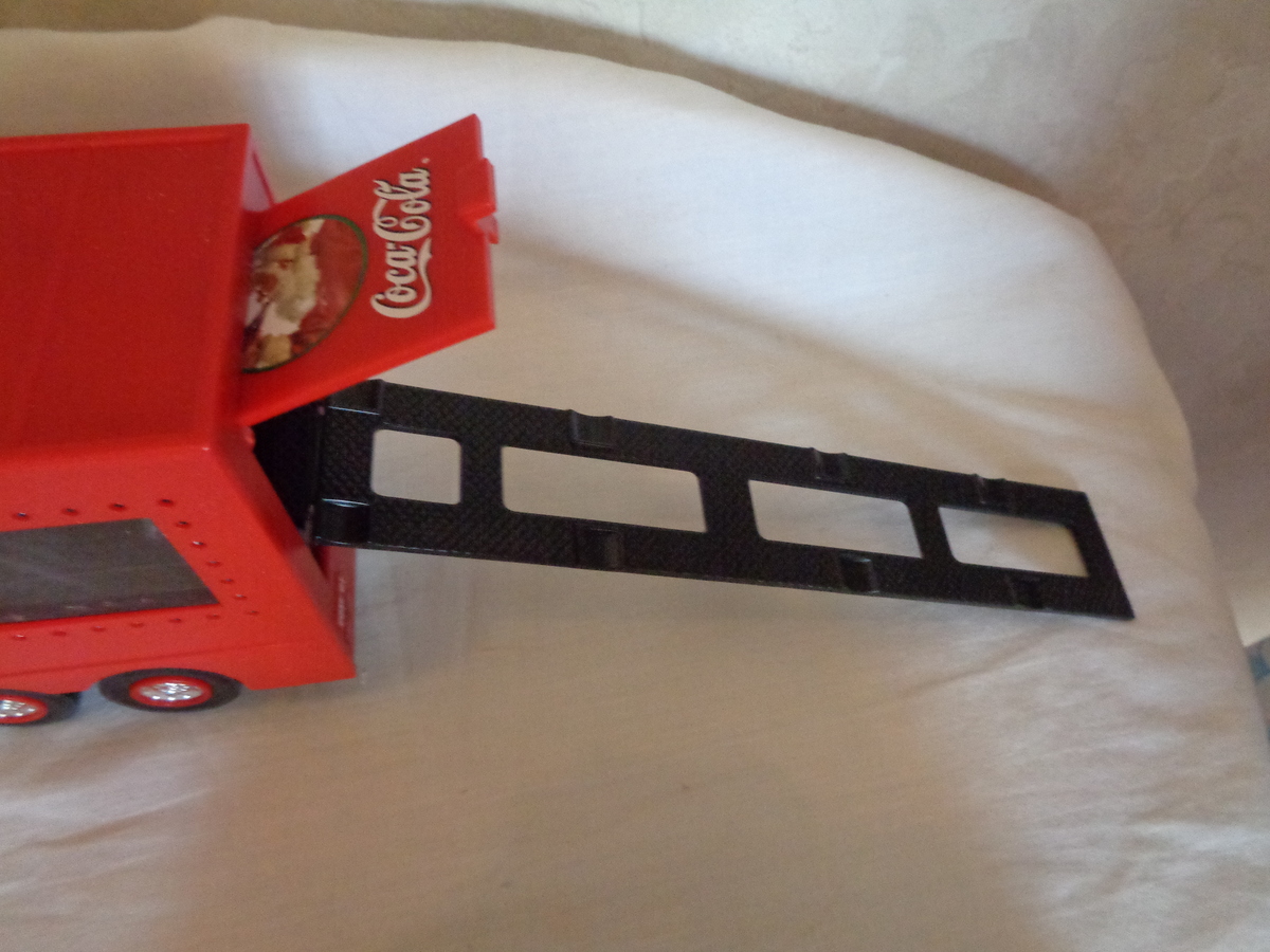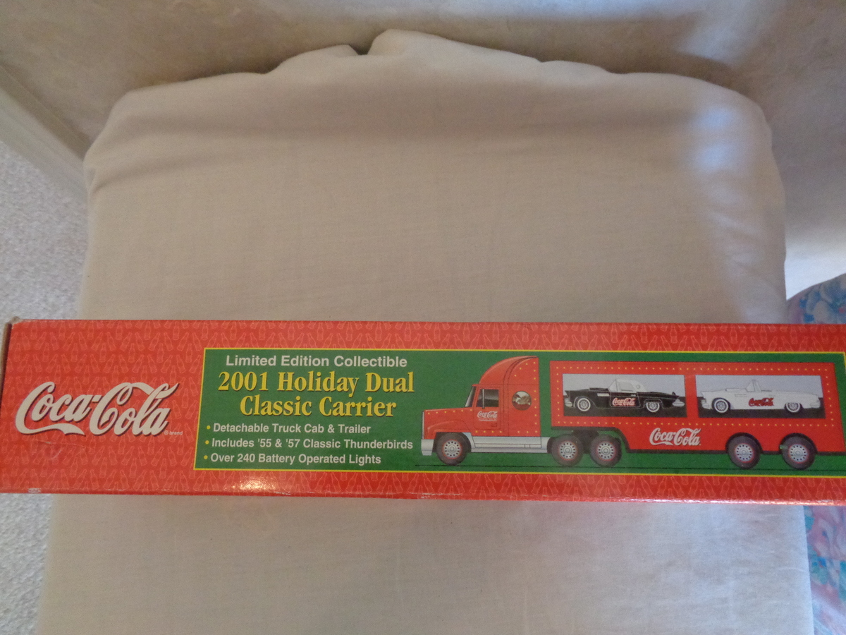 #6429 Coca-Cola Limited Edition Classic Carrier UPC: 797191102285. 2001 Holiday Dual Classic Carrier for ages 3 and up. Include ’55 ’57 Classic Thunderbirds, Still in plastic wrap. Detachable Truck Cab Trailer, Over 240 Battery Operated lights, not included. Battery installation (figure #1), Lights operation (Figure #2) Detachable cab Trailer (Figure #3) Pull out car ramp (Figure #4). I had to open box to take pix. Box has some minor damage, some carboard had to be taped to get truck back in box, but the truck is in excellent condition. Please see pix for a complete description.