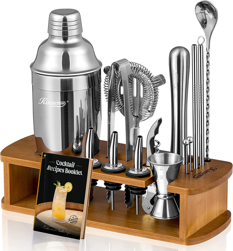 Made to Last: Upgraded 18/8 stainless steel bartender kit cocktail set is your best bet, which is specially thickened (0.8 mm) to protect itself from rust for lifetime and remain shiny and new after years of shaking, and it can withstand lots of rough and tumble, even being dropped, without letting you down. and the bar mixing set is safe in the dishwasher