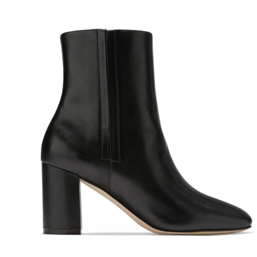 A square toe and block heel frame a contemporary leather bootie furnished with a cushioned footbed for lasting comfort.