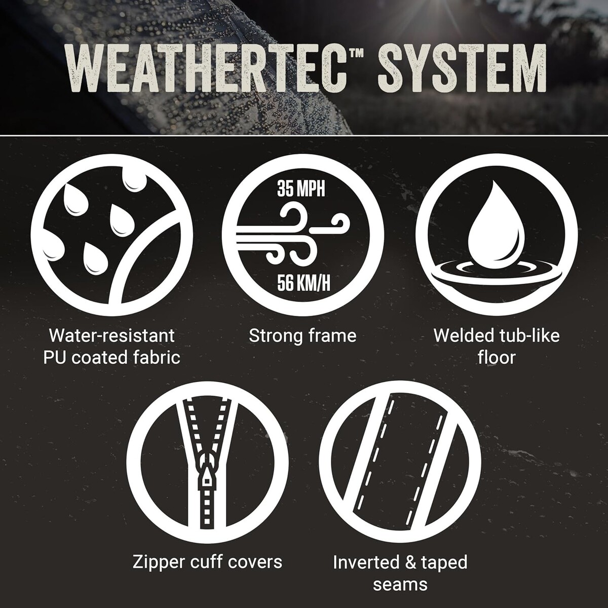 WeatherTec System features patented welded floors and protected seams to keep you dry, angled rainfly lets in light but not water