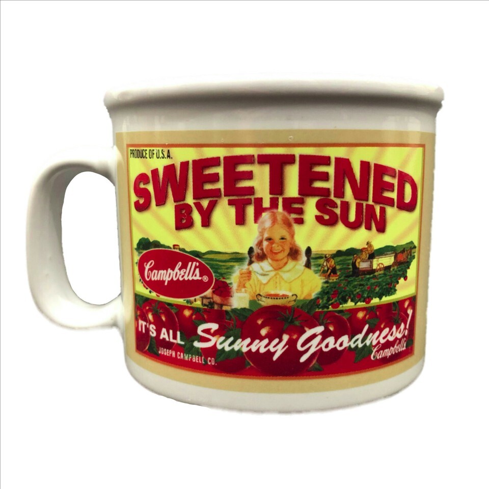 Remember when... These Campbell Soup Mugs will bring back lots of your memories. Set of 2 12 oz mugs, 1 of each style. Delicious vegetables, Sweetened by the sun on 1 mug and Tomato is a Fruit! with Sunny Good on the other mug.