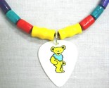 THE GRATEFUL DEAD DANCING BEAR GUITAR PICK IN YELLOW BABY BLUE COLORS ON AN ADJUSTABLE STRING CORD NECKLACE WITH RAINBOW COLORS STAINED REAL WOODEN BEAD ACCENTS BACK SIDE HAS TEXT GRATEFUL DEAD (WHITE) OFFICIAL JIM DUNLOP MED GUAGE DEAD HEAD MERCHANDISE